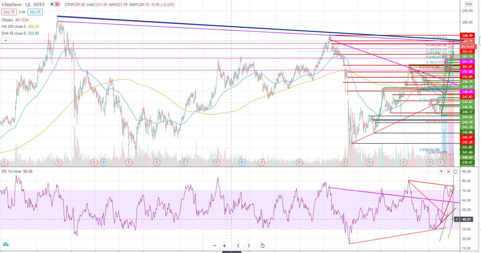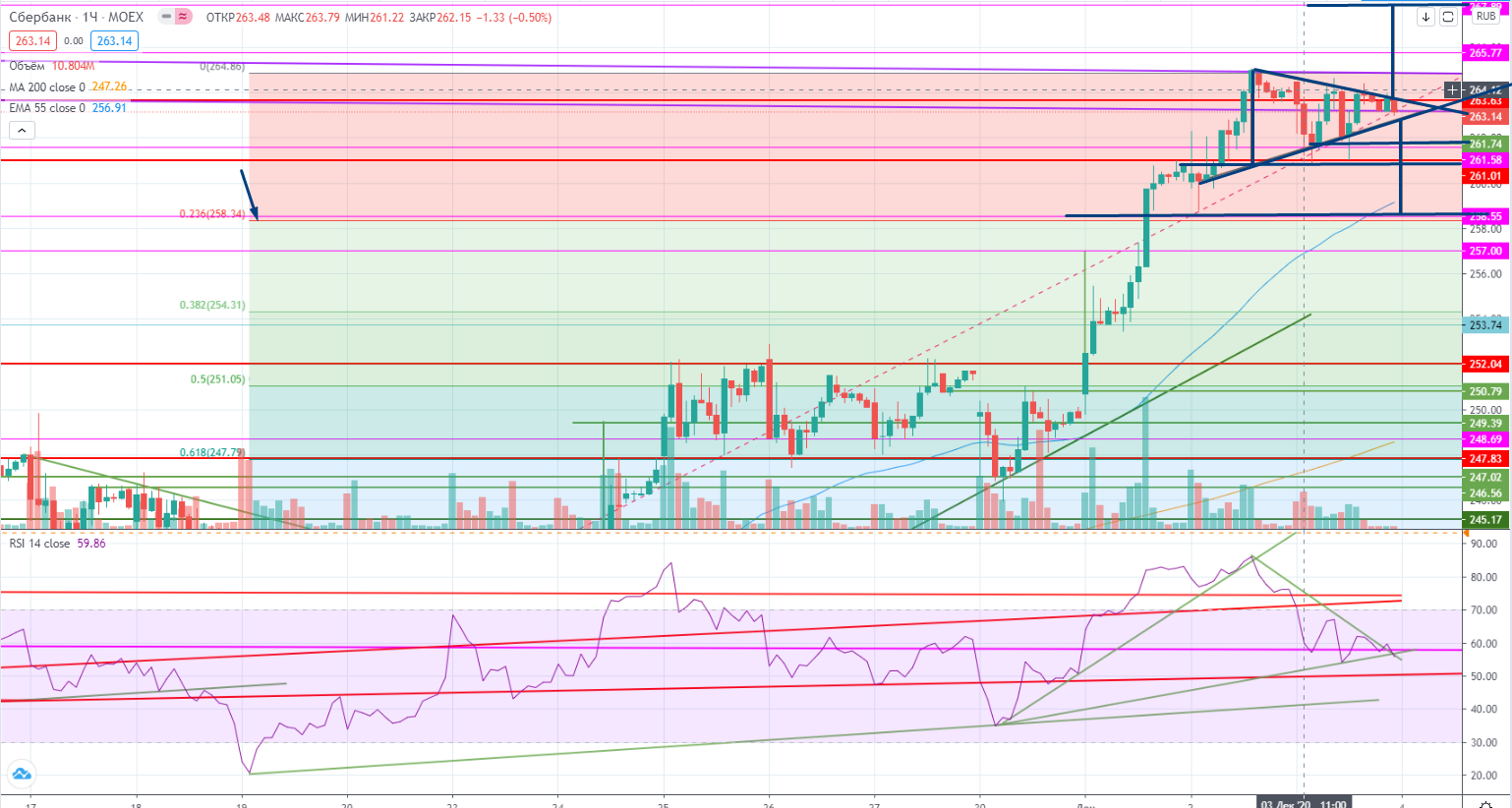 Но на часах стали более отчетливы видны уровни для входов и выходов. Т.к. я считаю, что с ростом в Сбере пока нужно повременить, я буду продавать под локальным хаем 250-, но теперь стоп стал очевиден-250,3+ по закрытию часа. И возможно даже с переворотом вверх, я к этому готов. RSI уже разрядился и находится в принципе в зоне, откуда можно снова пойти на пробой. И кроме этого рисуется треугольник с мишенью в случае пробоя наверх = 267,9± (что примерно совпадает с реперным уровнем на днях) . А в случае прохода вниз = 258,6± (причем эта мишень примерно совпадает пока с первой коррекцией 23,6% по Фибоначчи). Вот такая математика. Но пока находимся под уровнем закрывать шорт просто глупо. Лучше чуть допустить убыток, чем крыться здесь. Ведь дневная картина пока не понятная, а цена все таки под трендом.