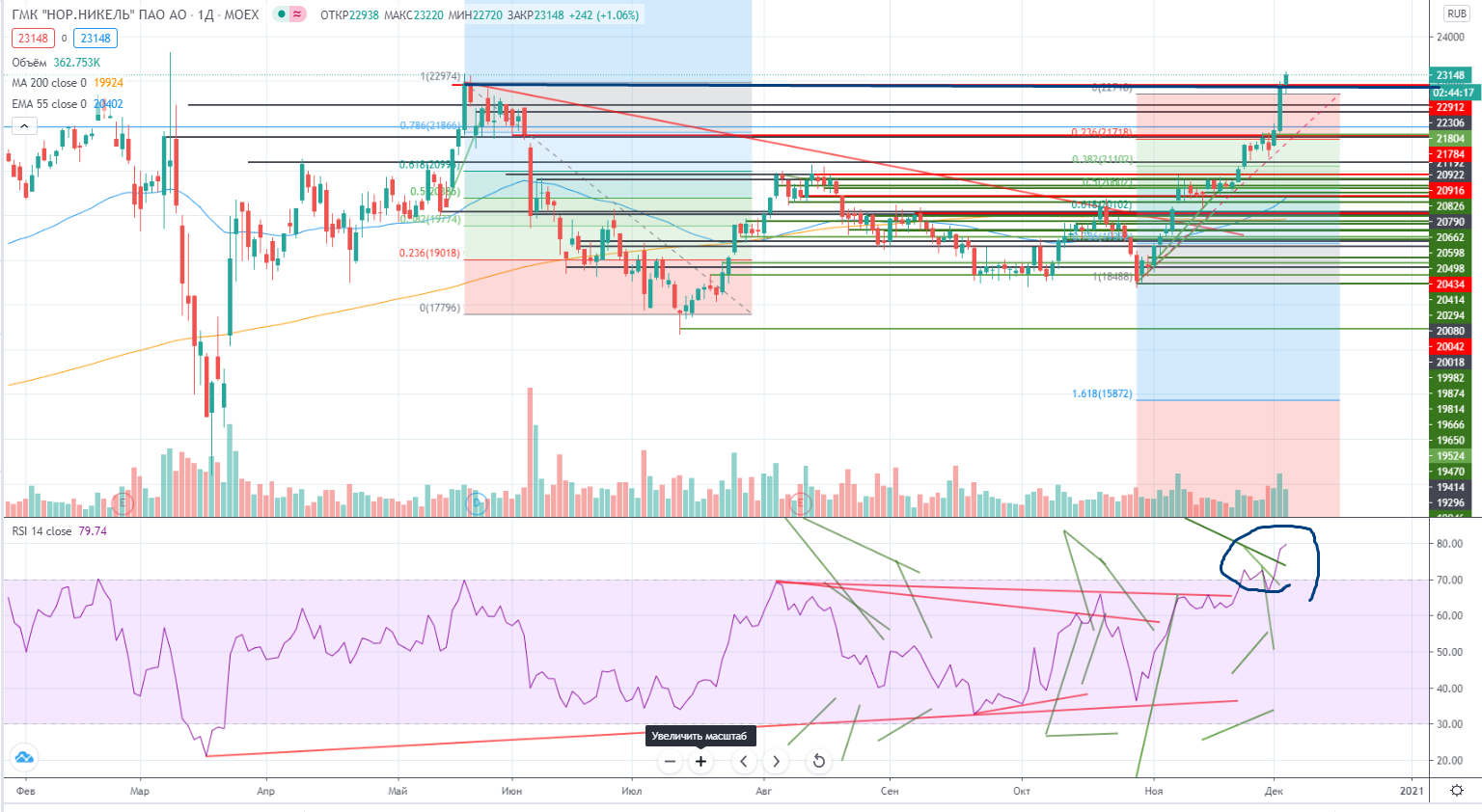 ГМКН обновил свой исторический хай и пока препятствий продолжения роста кроме перекупленности я не вижу. Очень сильная бумага. Но четких уровней для покупки нет, а от шорта пока надо воздержаться, могут продолжать выносить шортистов.