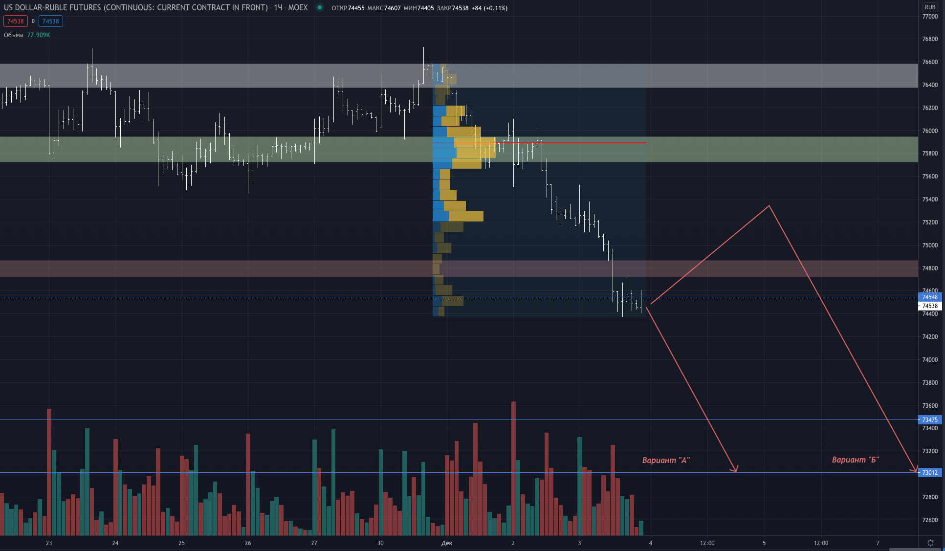 Потенциал хода вниз у пары еще есть. Первая зона, где ждал бы покупок ~73600 по фьючу, потом ~73000 и последняя линия обороны -70 по фьючу.