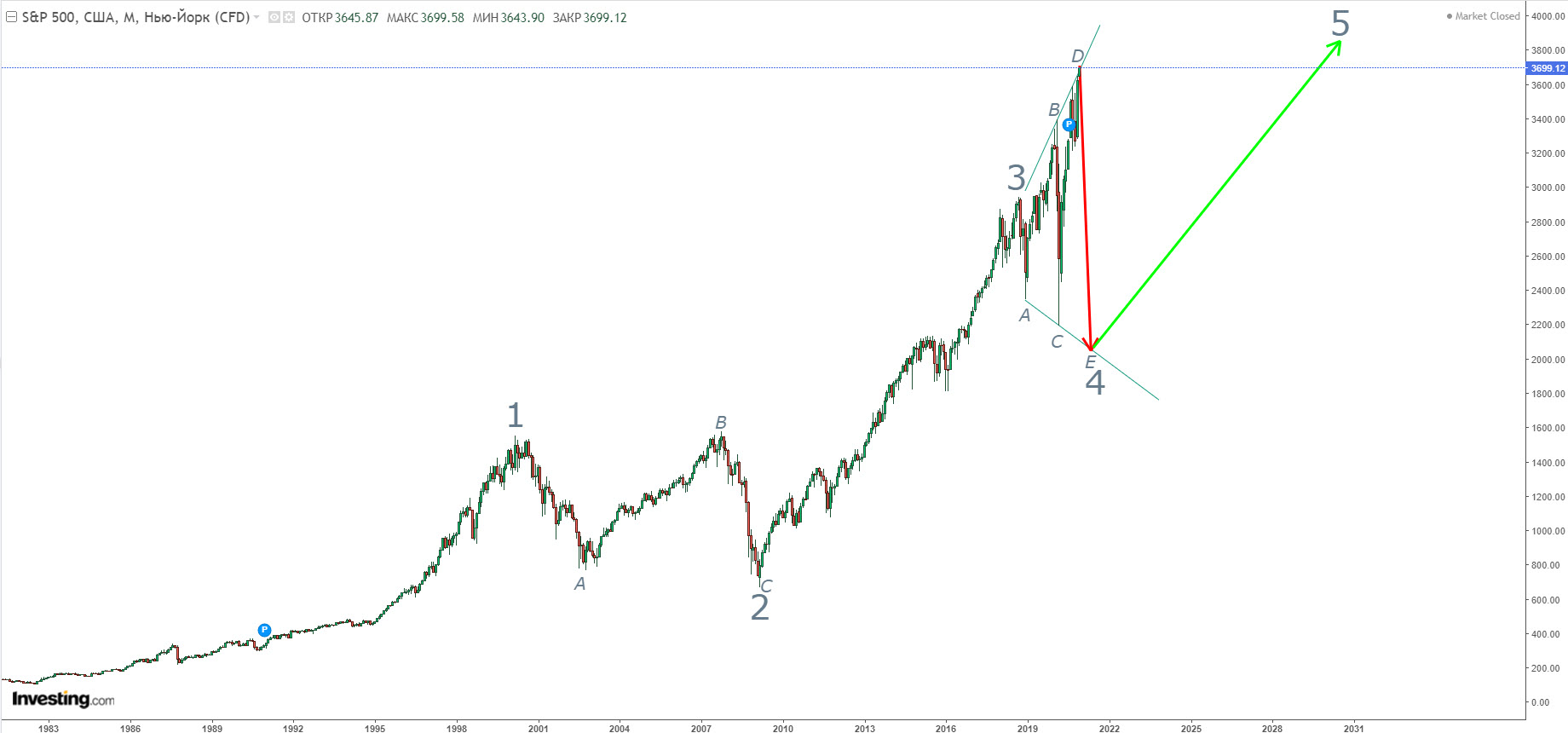 Итак, для начала один из довольно смелых, но вполне реалистичных сценариев по S&P 500 на ближайшие 10 лет. Мы его уже обсуждали в чате, но думаю стоит сохранить «на память» и посмотреть, будет ли исполнятся? Несмотря на то, что это «ненавистный всеми Эллиот», тут ТА скорее, как вспомогательный инструмент, основное – фундамент.