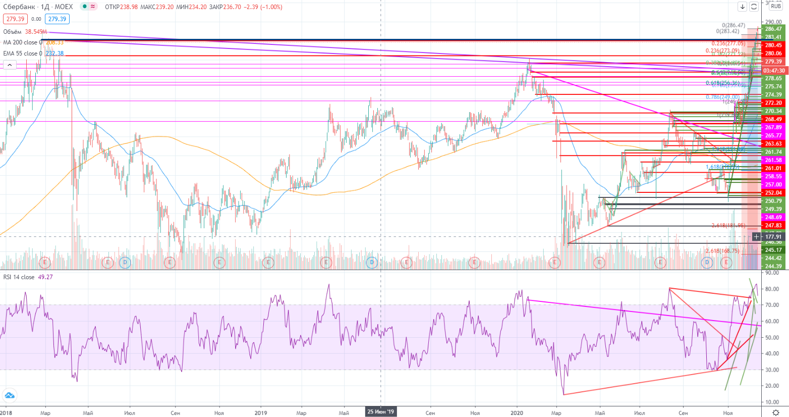 Я совершил конечно ошибку, я на откате купил. Сначала тестово ¼, потом добавил… Но пробой был очень мощным, и я не был готов зафиксировать убыток. Вместо этого решил запирамидить еще. Средняя получилась 282,53. Да, высоко. Потом я нашел некий уровень- « 275,8-276,25 (ур.гэпа + тренд), его можно использовать в качестве уровня стопа 275,5-). Можно на нем пробовать покупать (докупать в моем случае). Но при подходе снизу к 280,3 нужно прикрывать лонг.»-это рекомендация, данная мною в ходе торгов на канале ( t.me/scalponline ).