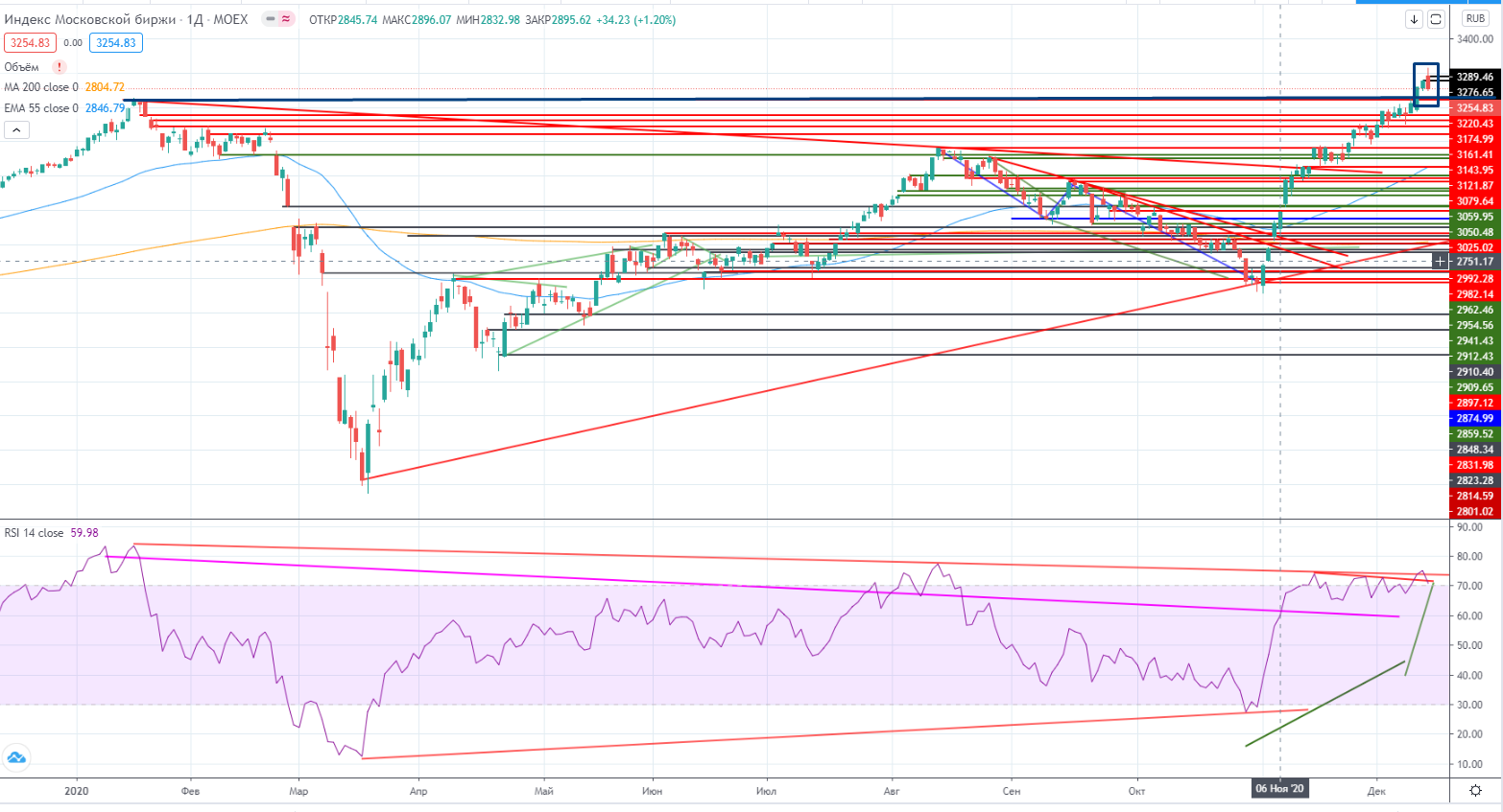 При этом пара доллар/рубль вела вчера прямо с утра не совсем адекватно. Доллар на то, что не падал, а даже пробовал локально отрастать. И вот на коррекции его выдрали вверх. Я эту ситуацию немного предвидел и купил при пробое (https://www.finam.ru/analysis/marketnews/indeks-mosbirzhi-dostig-novogo-istoricheskogo-maksimuma-20201214-09300/). Правда закрылся очень рано, но что поделаешь, в голове все еще сидел рост на фондовом рынке.
