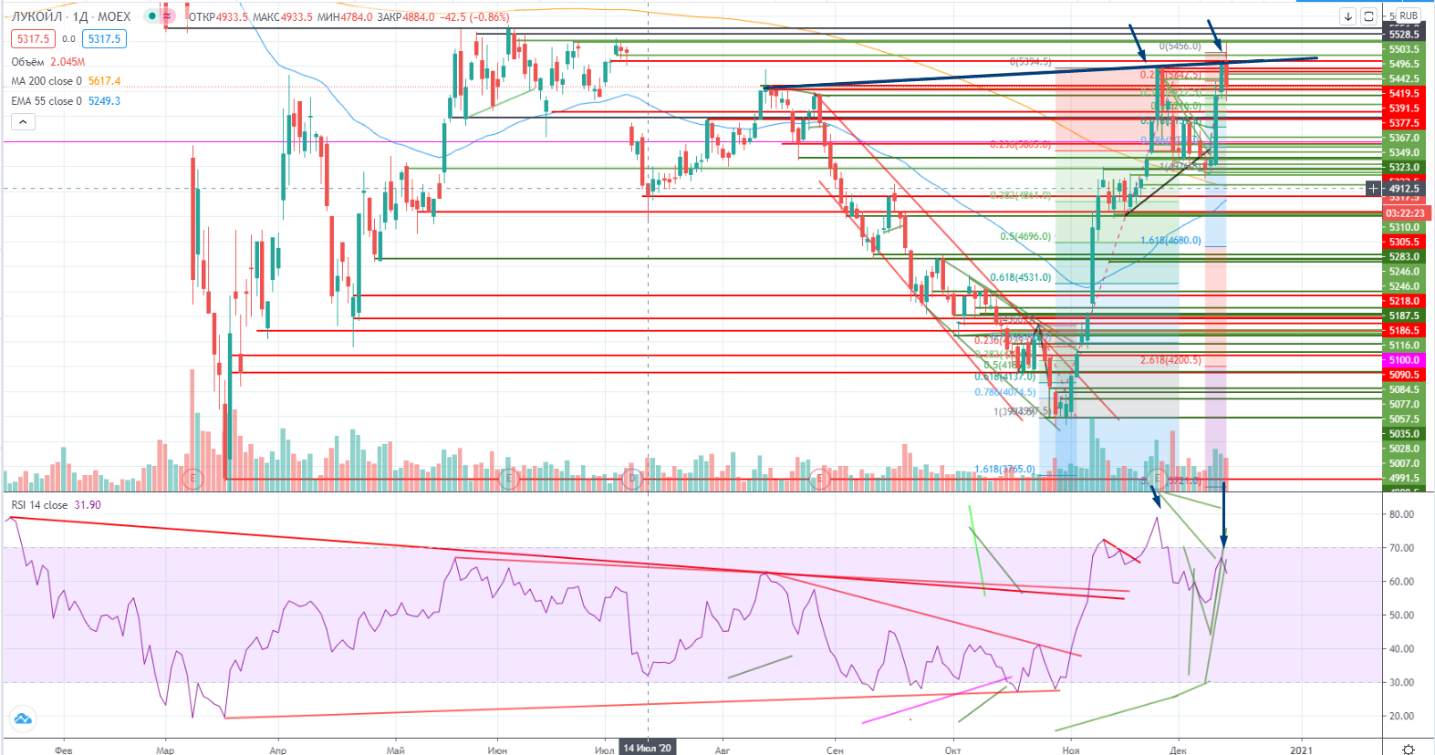 Лукойл на дневном графике протестировал новый тренд. С пока потенциальной дивергенцией. Ситуация в нем пока непредсказуемая, может как вверх пойти, так и вниз… Ситуация и на часах тоже запутана. В моменте можно было продавать при закрытии ниже 5370 (гор.ур.+RSI в шорте), стоп 5380+. Возможно уровень остался, но надо смотреть на RSI.