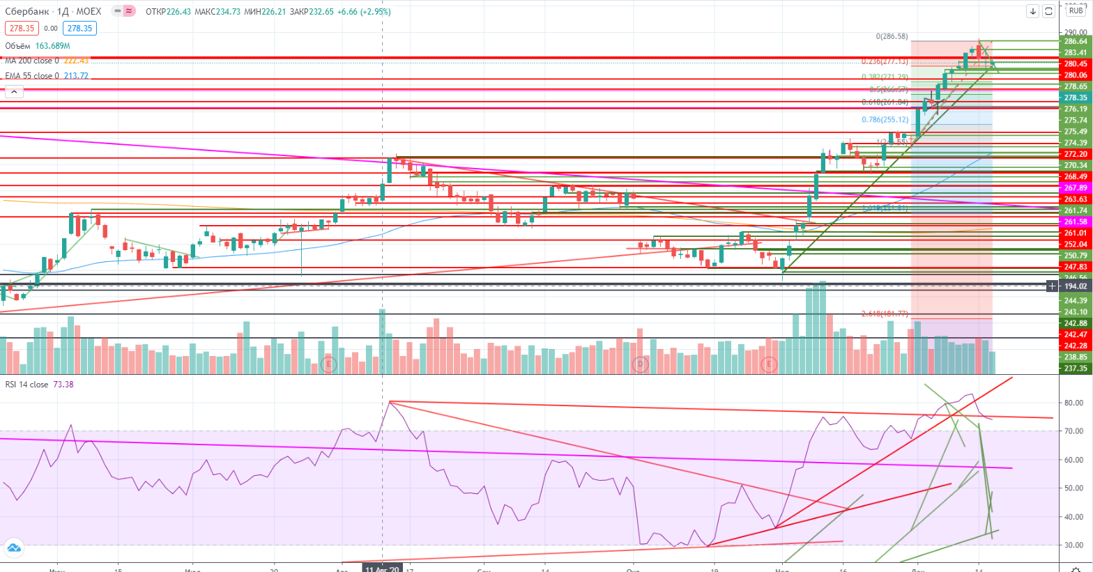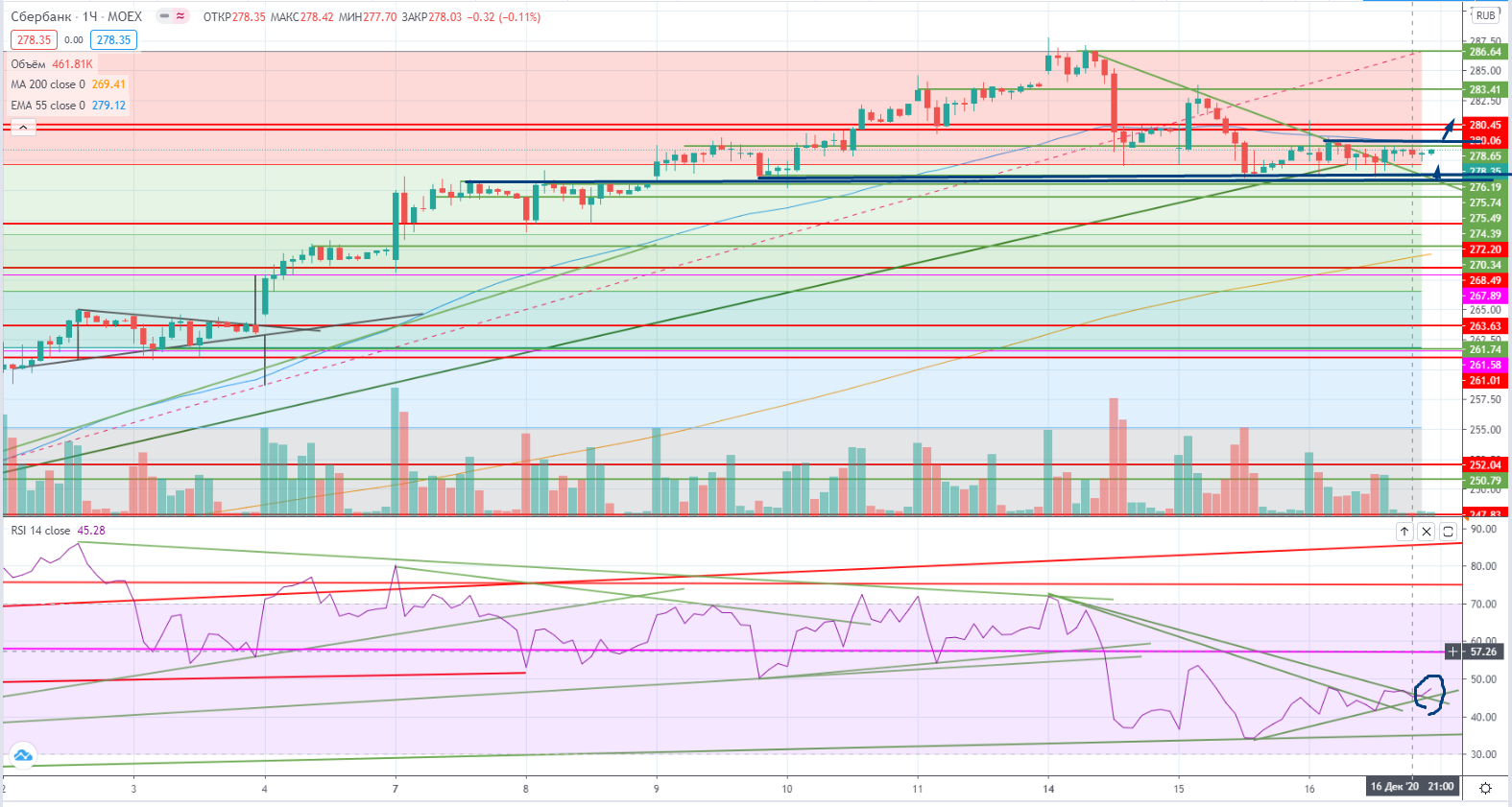 Потом я сидел почти весь день без сделок, рассуждал, что может это Судьба «не хочет» чтобы я торговал дальше. Но на предпоследнем часе я снова вошел в сделку в Сбере, но от покупки. Осуществил данный мною прогноз накануне (https://www.finam.ru/analysis/marketnews/rost-nefti-mozhet-byt-prodolzhen-20201216-09350/) — « Но на часах опять же есть уровни, которые пока не сдаются, это зона — 275,5-276,25 (ур.гэпа + тренд), его можно использовать для покупки со стопом 275,3-. Это идея на сегодня №1», купил ¼ по 276,23 и закрыл почти сразу по 277,47. Так что я снова оказался прав. Этот уровень остается и на сегодня. Это снова будет идея №1.