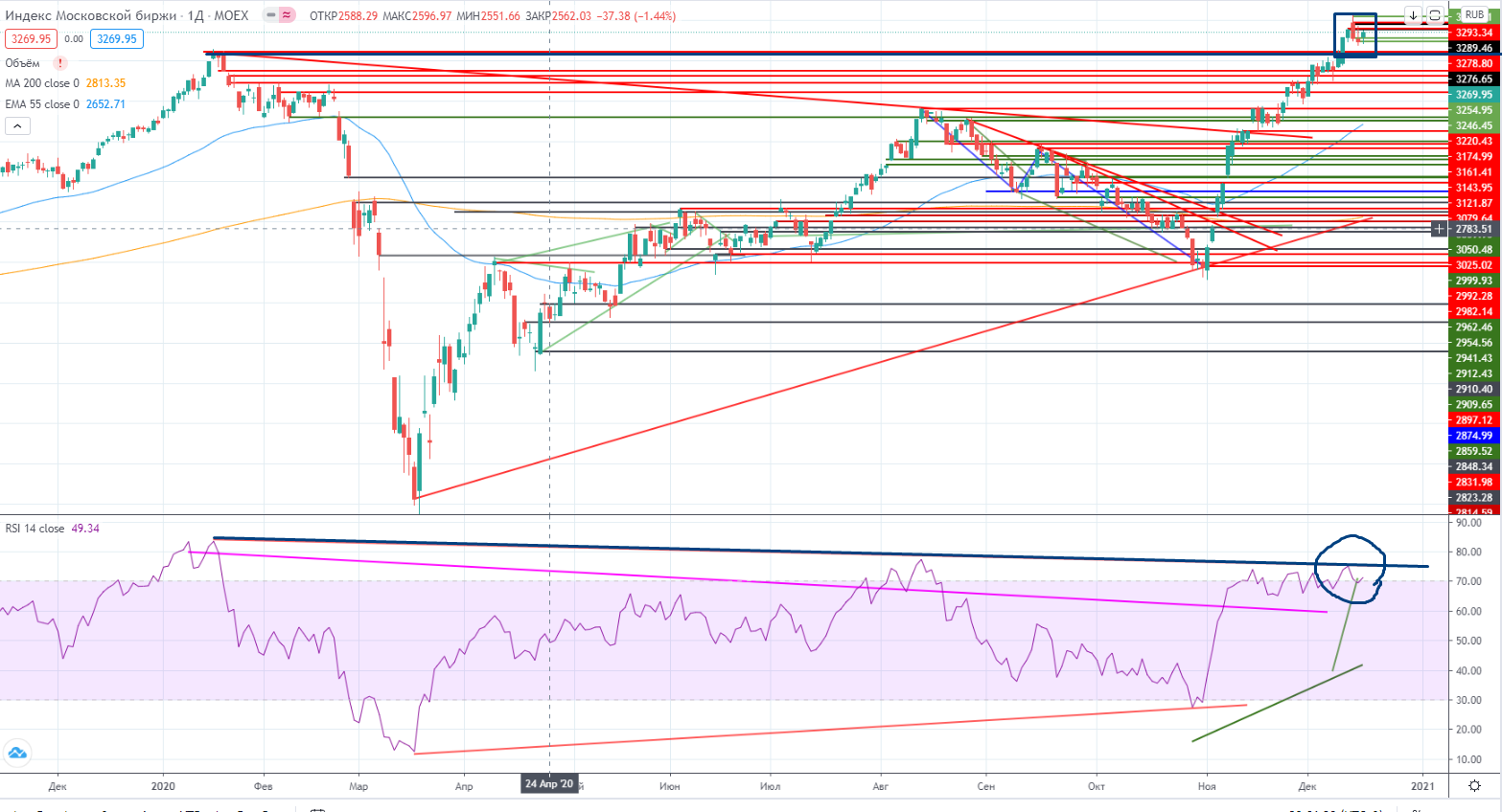 На нашем рынке до последнего момента рисовалось «подтверждение подтверждению» разворотной формации, но на последнем часе «основной» сессии индекс ММВБ вырвали вверх, и по итогу дня даже нарисовали что-то на подобии разворотной формации, но уже вверх. «Снова-корова» начинается. RSI снова под трендом, так что вопрос итак стоявший о возможной коррекции снова актуален. Ну не хочет наш рынок падать и все. То одна бумага растет, то другая. И драйверы все появляются новые. Так что интрига до сих пор сохраняется. Так в принципе и должно происходить после пробития исторического хая (с учетом предыдущего ошеломляющего и не логичного роста).