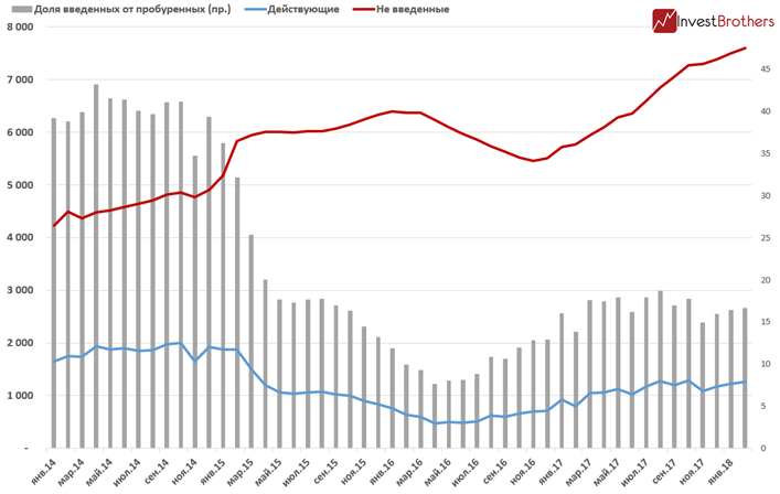 Сейчас из всего количества пробуренных скважин в работе находится лишь 17%, в то время как в 2014 г. – более 40%. Благодаря такому запасу объясняется и резкий рост добычи в январе текущего года – как только стало рентабельно извлекать нефть на других участках, нефтяники активизировали свою деятельность.