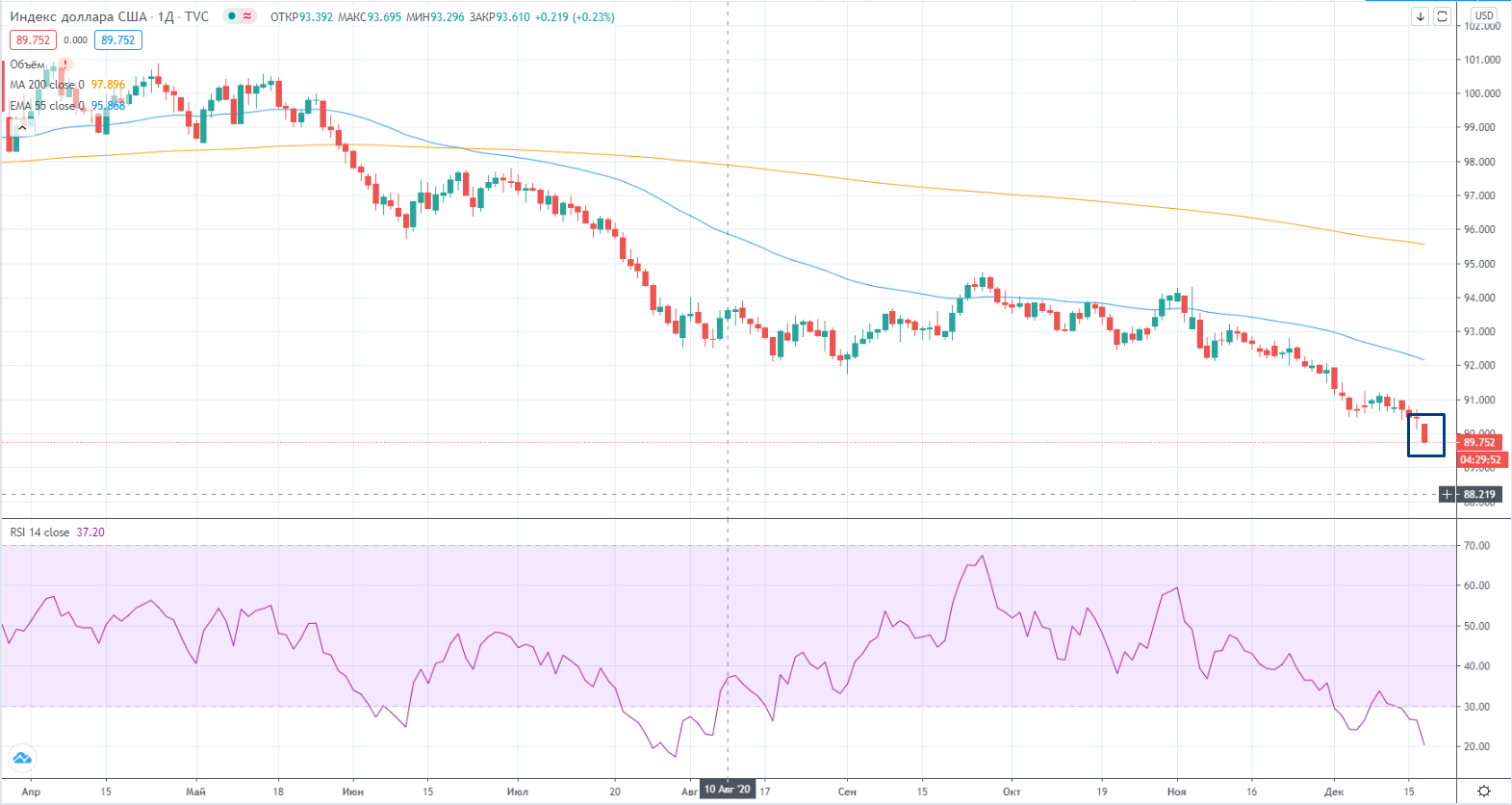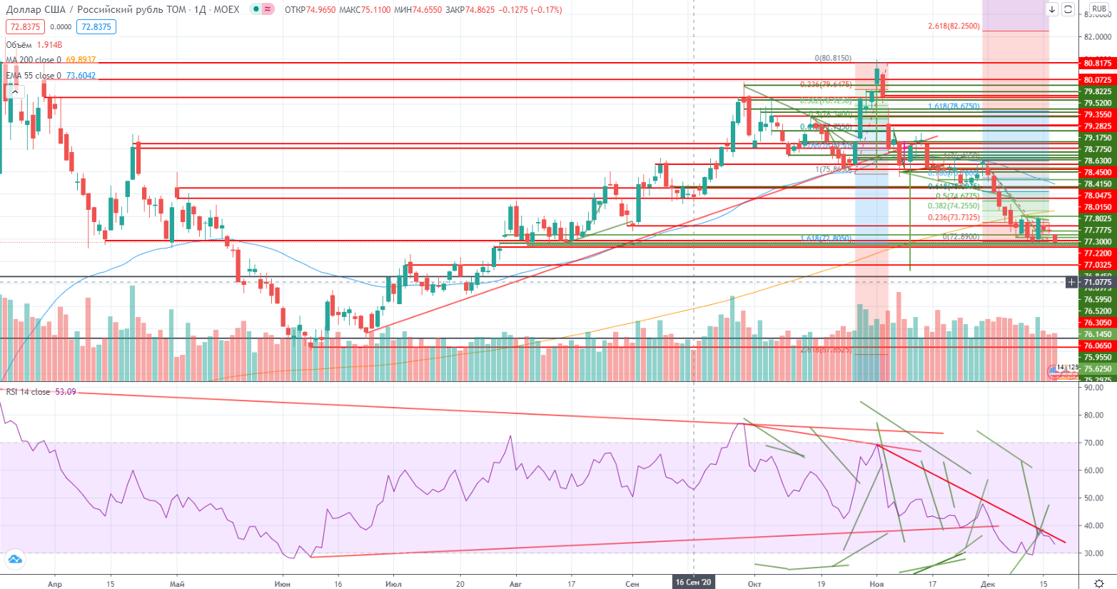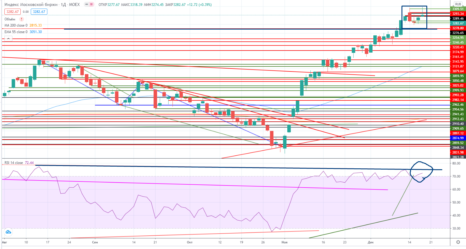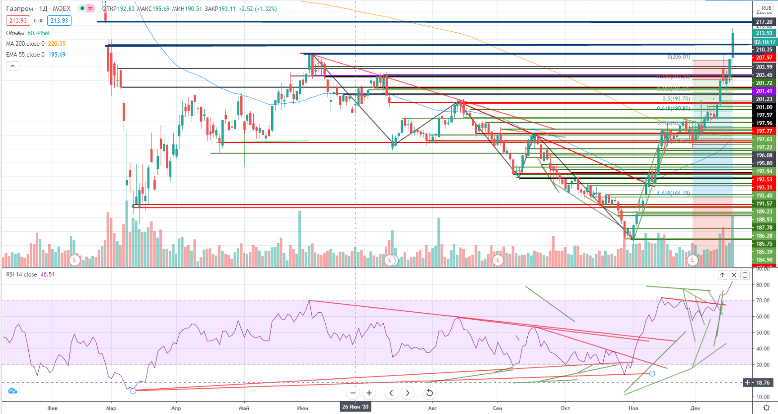 Как я и писал накануне (https://www.finam.ru/analysis/marketnews/neft-ustanovila-novyiy-lokalnyiy-xaiy-20201217-09350/)- в индексе ММВБ « RSI снова под трендом, так что вопрос итак стоявший о возможной коррекции снова актуален. Ну не хочет наш рынок падать и все. То одна бумага растет, то другая. И драйверы все появляются новые. Так что интрига до сих пор сохраняется. Так в принципе и должно происходить после пробития исторического хая (с учетом предыдущего ошеломляющего и не логичного роста).».Так и случилось, появился новый драйвер для роста-Газпром. Битва на хаи по индексу ММВБ продолжилась...