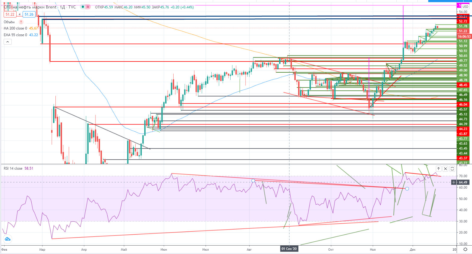 В нефти все буднично тоже, рост продолжается. Больше добавить к сказанному ранее (https://www.finam.ru/analysis/marketnews/neft-ustanovila-novyiy-lokalnyiy-xaiy-20201217-09350/) нечего. «Нефть установила новый локальный хай, причем она это сделала с проходом RSI своего дивергентного тренда, и судя по графику путь к $52,76-$53,39 открыт.». Возможную коррекцию надо откупать. Отмена-проход и закрепление ниже 50,8- по споту на часах. В моменте тоже ниже...
