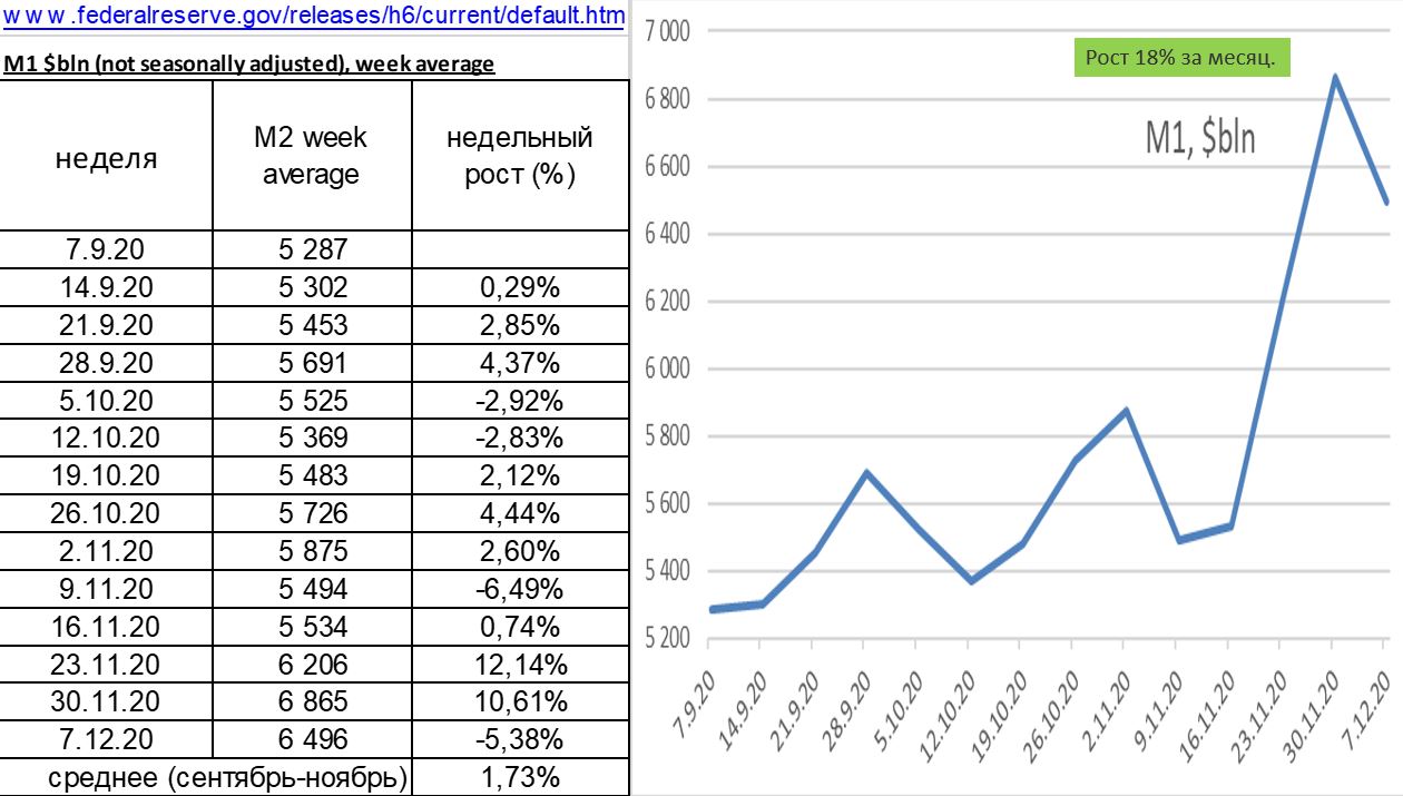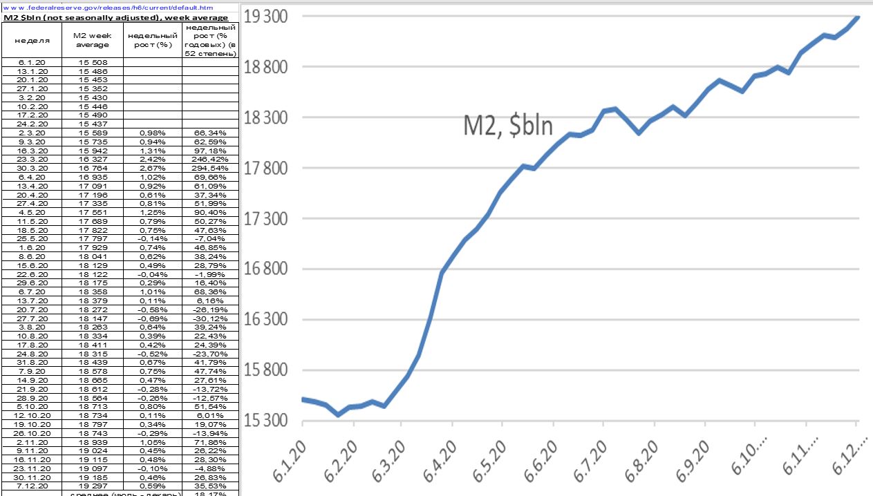 Денежная масса М2 в США выросла на 18% за месяц по 07 12 2020г.