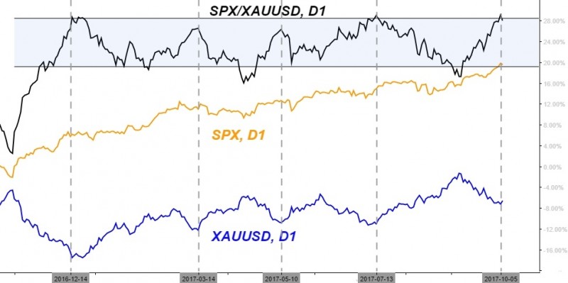 Отношение SPX/XAUUSD находится в канале с декабря 2016 г., как можно заметить, сейчас кривая подошла к верхней границе. Логика этой взаимосвязи, на мой взгляд, заключается в диверсификации и хедже портфелей защитными активами (золотом), т.е небольшая часть портфеля (малый процент от общего капитала) отводится под блестящий металл. C приходом денег на фондовый рынок, часть перетекает в золото и наоборот.