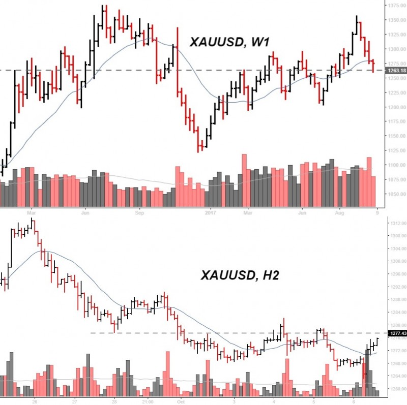 На мой взгляд, золото достигло привлекательных цен для покупки (график w1). На график H2 видно формирование закругления цены, в пятницу (06.10.2017) в активе был вынос вниз с возвратом на объемах к прежним значениям, при прохождении вверх горизонтальной пунктирной линии можно пробовать брать.