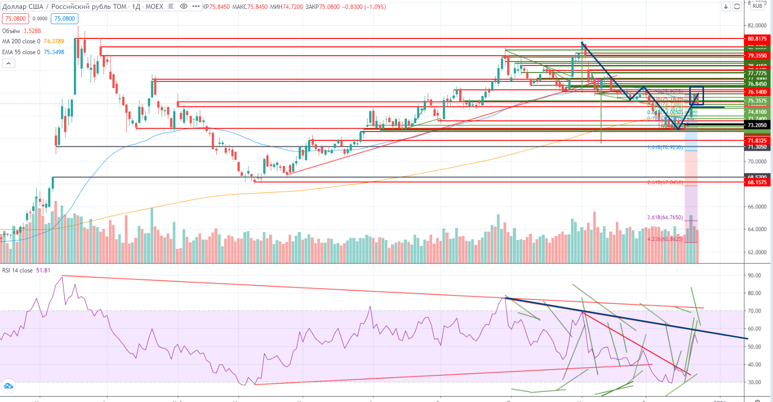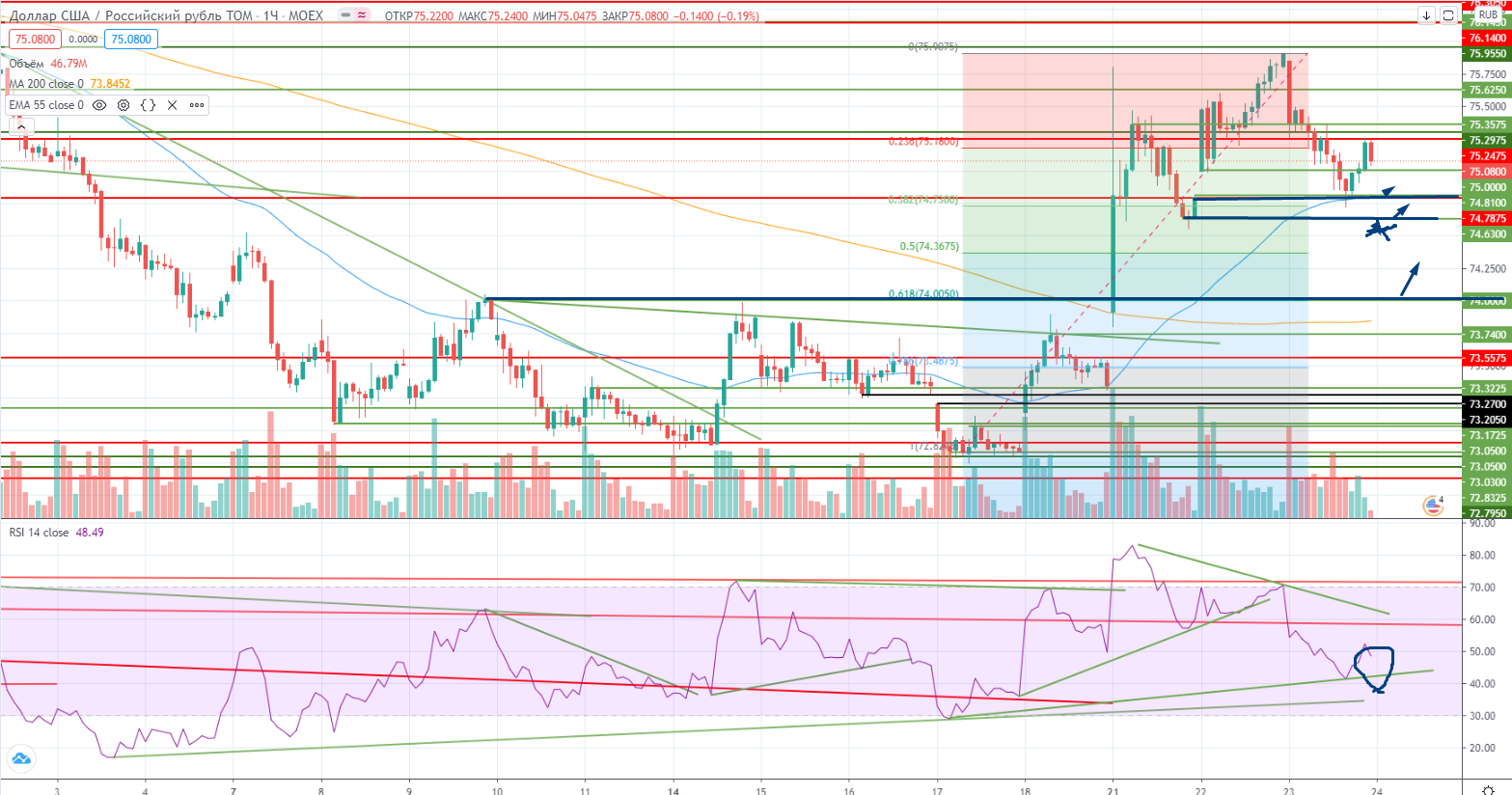 На часах же есть уровни, на которых надо было покупать. На нижнем 74,8+ можно было часть покупать, докупать можно пробовать по 74,65 (локальный минимум), стоп 74,55-. Я и купил. Правда не спот, а фьючерс (по 75385), но идея одинаковая. Если пройдет ниже, то можно ожидать похода к уровню 74 (из-за сильного выноса накануне путь свободен) (хотя надо признать RSI пока не подтверждал покупку, только цена, сейчас же и RSI может подтвердить мою теорию). Закрыл по 75777. Но идея с лонгом осталась и на сегодня.