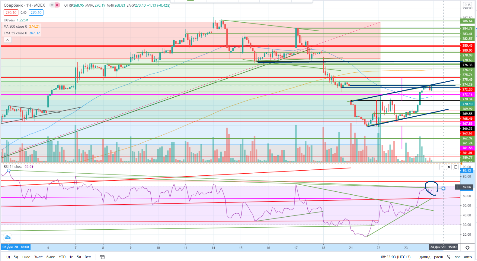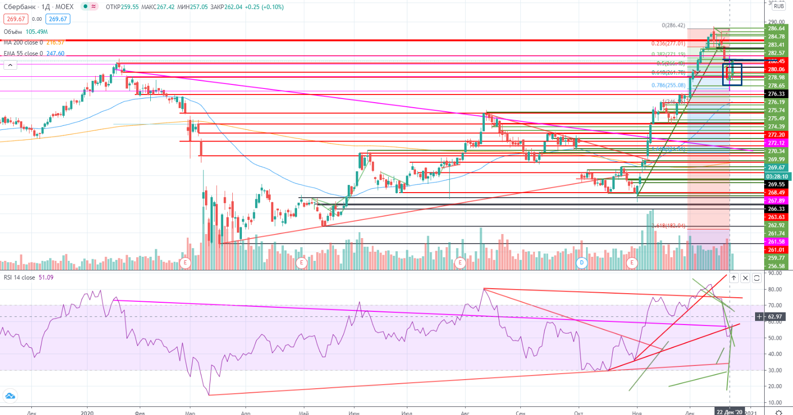 Как я писал вчера (https://www.finam.ru/analysis/marketnews/rynok-xot-i-otskakivaet-no-ne-isklyuchayutsya-eshe-kak-minimum-povtory-lokalnyx-loev-20201223-09450/) — «Осталась по большому счету одна бумага, которой можно торговать адекватно-Сбер.». Она и осталась для меня по большому счету единственной бумагой из мною торгуемых. Поэтому я остановлюсь именно на ней.
