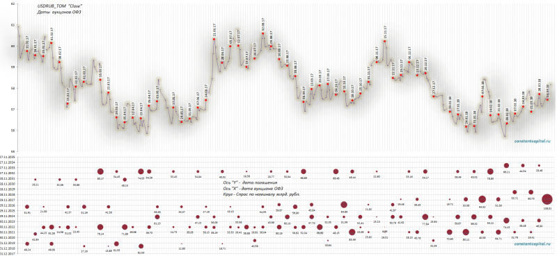 График размещений ОФЗ (по параметрам - дата погашения; спрос при размещение) в соотношение с графиком USDRUB