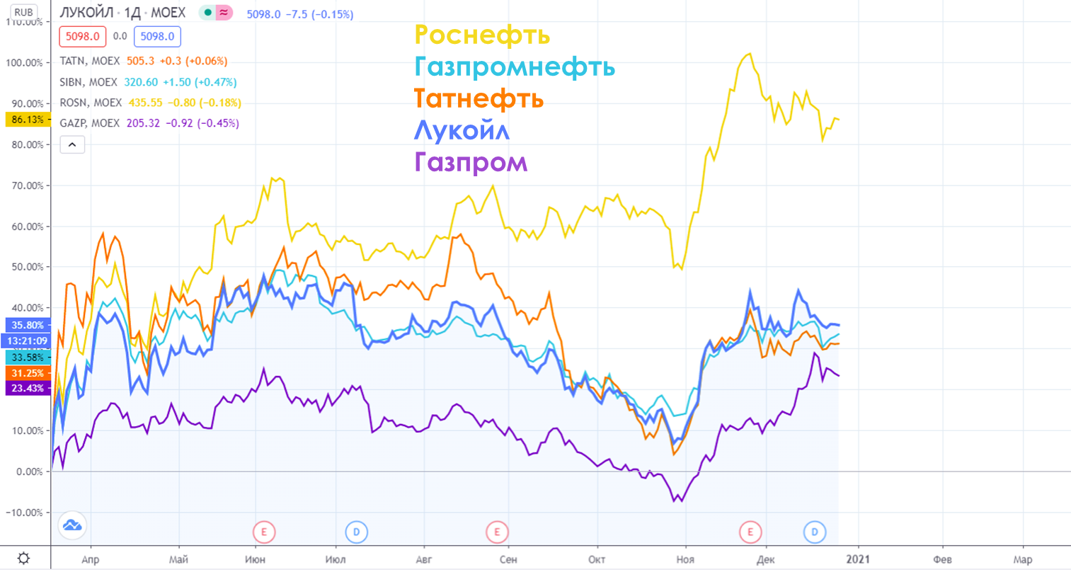 Котировки Лукойла, Газпромнефти, Татнефти, Роснефти и Газпрома с начала мартовского провала: