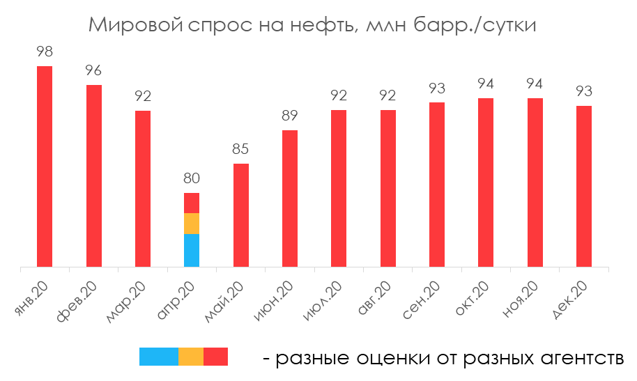 Все эти действия нужны, пока мировой спрос на нефть чувствует себя слабым. Он «заболел» вместе с началом пандемии и массовым закрытием экономик. Его болезнь протекает следующим образом: