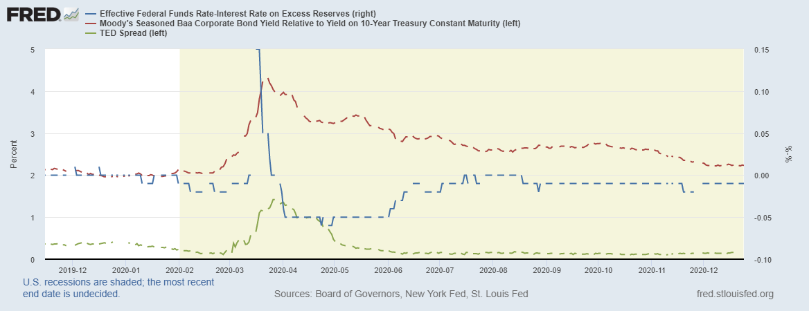 Красная линия – это разница между доходностью корпоративных 10-летних облигаций и соответствующих трежерис. Ситуация на рынке корпоративного долга стала в плоскую динамику.