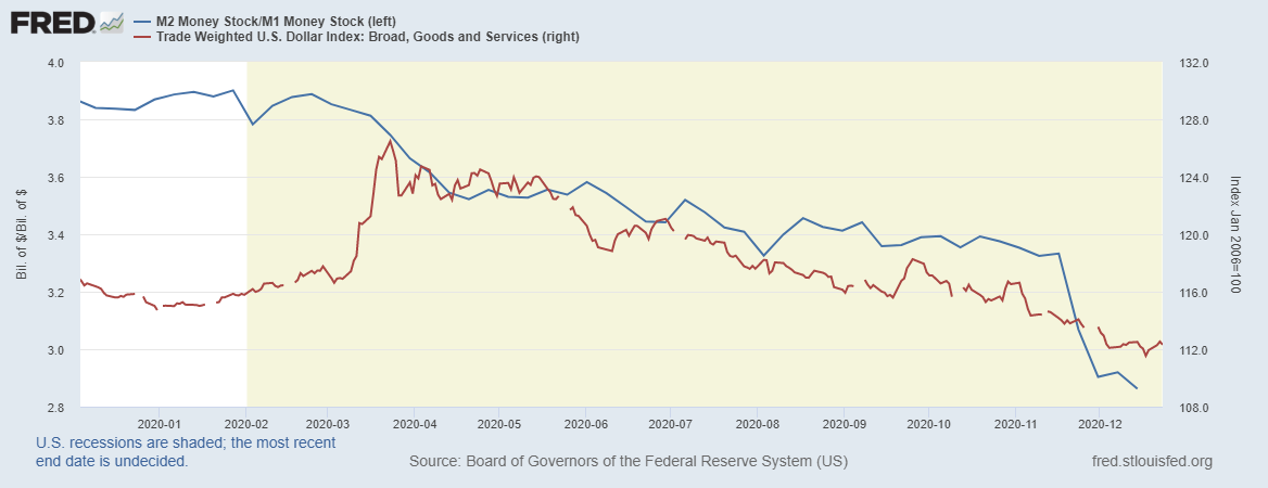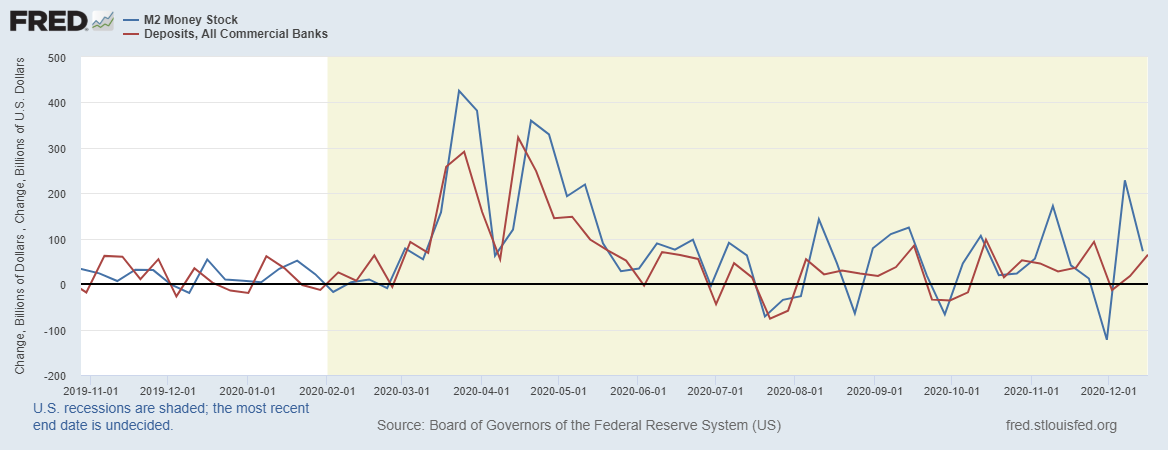 Ввиду роста снижения объемов счетов М2 вырос намного меньше, чем М1, который на прошлой неделе подрос на 157 млрд долларов, что привело к снижению денежного мультипликатора, и снова переписан исторический минимум по данному показателю