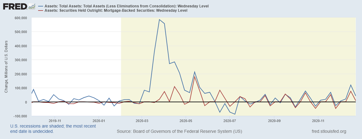 Красная линия – динамика баланса ценных бумаг, обеспеченных ипотекой. Как видим, сейчас именно скупка ипотечных долгов является основной причиной роста баланса ФРС.