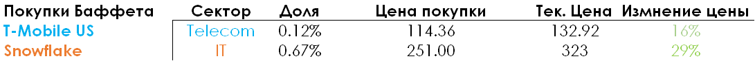 В сфере телекомов Баффет купил небольшую долю в T-mobile US (TMUS) на 276 млн долларов, что составляет около 0,12% его портфеля.