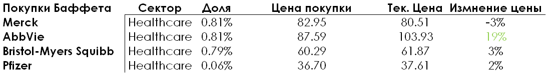 Единственно значимым изменением в портфеле Баффета является ставка на сектор здравоохранения через Merck, AbbVie, Bristol-Myers Squibb и Pfizer.