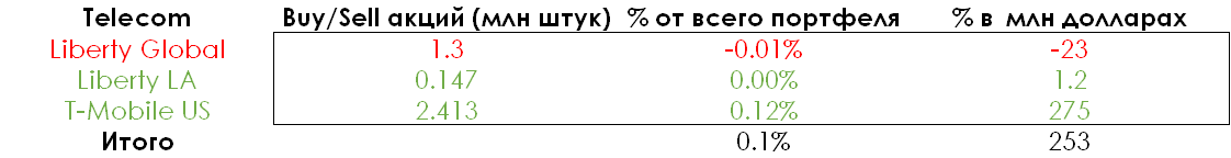 Баффет незначительно нарастил долю в телекомах (0,1% от всего портфеля). Liberty Latin America является дочерним предприятием Liberty Global. По сути, Баффет поменял регионы телекомов: перешел с Европы (Liberty Global) на Северную (T-Mobile US) и Южную Америки (Liberty LA).