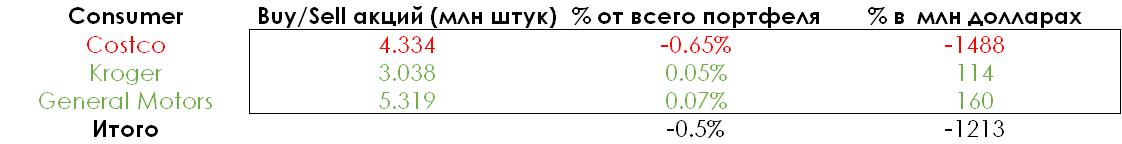 Баффет сократил долю потребительских товаров на 0,5% от величины портфеля. Он поменял Costco на Kroger и сделал небольшую ставку на электромобили через General Motors.