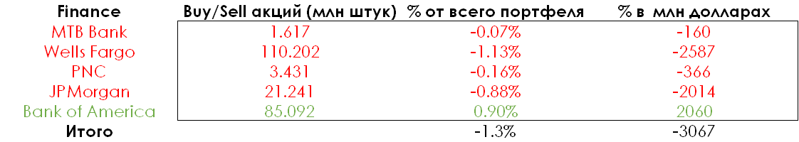В сухом остатке Баффет уменьшил долю во многих финансовых активах. Исключением стал Bank of America — ему Баффет отдал предпочтение в отличие от других представителей Большой Четверки — JPMorgan и Wells Fargo. Всего финансового сектора в объемах от портфеля стало меньше на 1,3%.