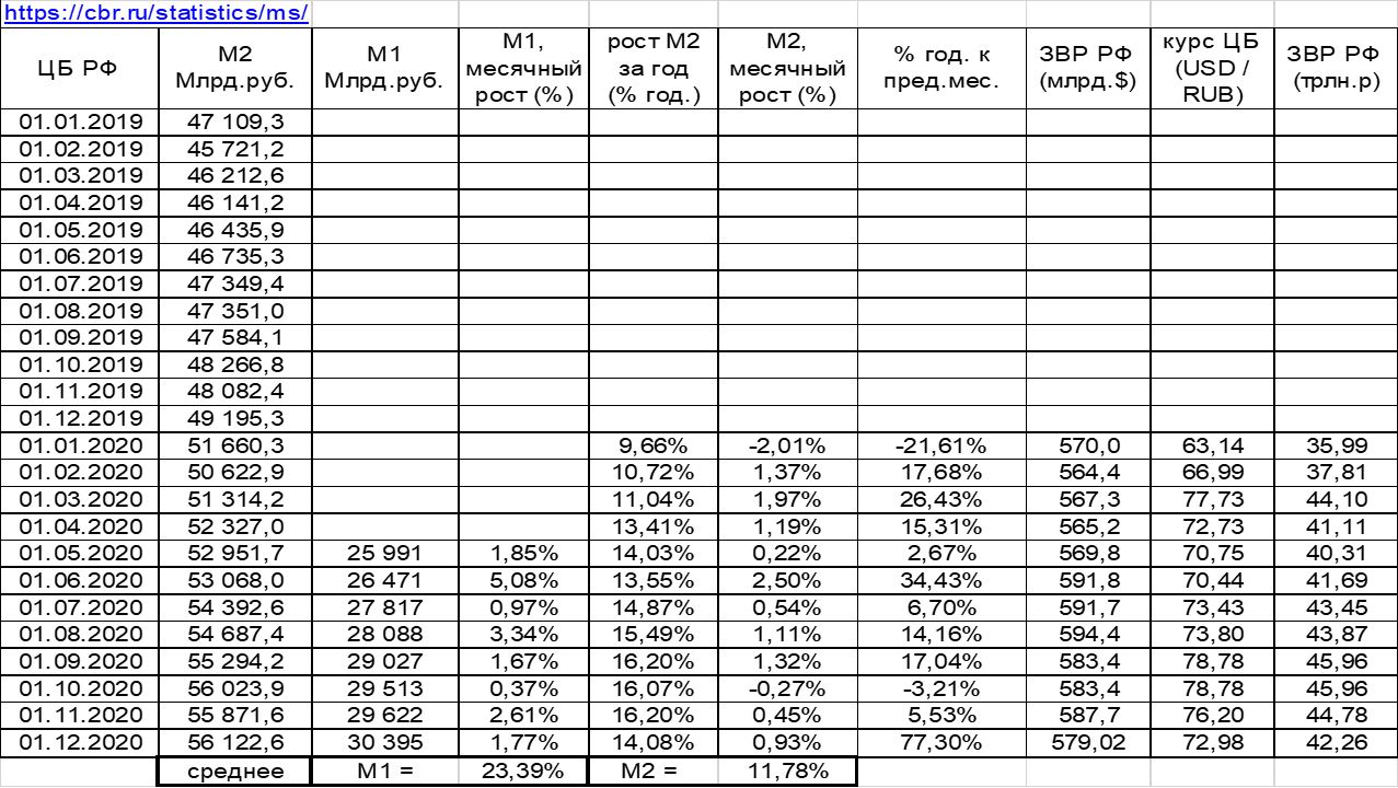 Денежная масса М1 в 2020г. росла на 23%, денежная масса М2 на 12%.