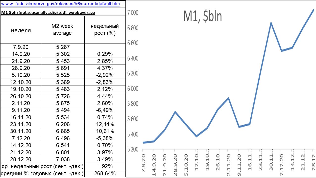 М2 в США в 4 кв. 2020г.растет на 0,26% в неделю, а М1 почти на 2% в неделю.