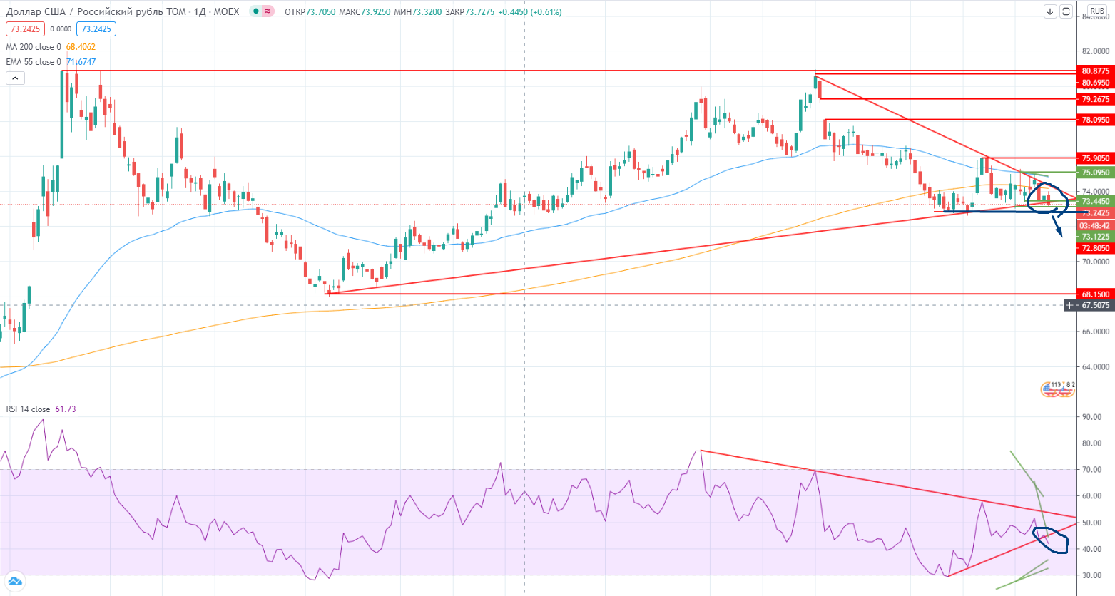 В паре доллар/рубль произошел пробой локального восходящего тренда и RSI тоже пробил свой дивергентный тренд. Ни решение Минфина по покупке валюты, ни страх возможных санкций уже не так сильно влияют на валютный рынок. Без покупки со стороны государства при такой цене на нефть, рубль должен стоить намного дороже. Государство понять можно, цена нефти в бюджет заложена по цене $43,3, огромный профит имеет государство, да и потратились, удовлетворяя потребность населения в районе 80, в этом я логику государства вижу. И еще раз повторю, НИКОМУ НЕ НУЖЕН КРЕПКИЙ РУБЛЬ. Возможна такая ситуация, Минфин сейчас наберет валюту, нефть пойдет в коррекцию, наш фондовый рынок тоже, а чисто технически есть незакрытый гэп 78-79,3, к нему может и прийти в итоге рубль. А если введут санкции, то эта вероятность вырастает в разы. Но покупать только уповая на это не стоит, ведь судя по графику (если он еще работает) очень возможно и дальнейшее укрепление рубля вплоть до уровня 72,8, а при проходе дальше-еще сильнее… Торговля с государством дело неблагодарное...