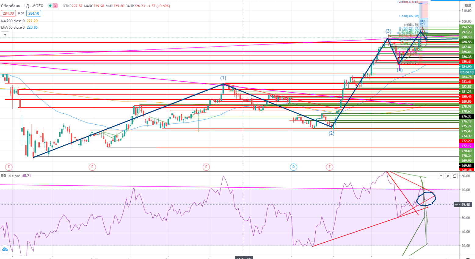 Возможно (!) Сбер рисует полноценную 5-ти волновую коррекцию (на третьей волне не было дивергенции), а значит может сходить как минимум до пред.лоу 281,4, может и ниже, к тренду (278,3+- на данный момент) или даже к горизонтальной зоне поддержки 275,7-276,3, там можно в принципе встречать. Но еще раз повторю, реперная зона на днях 283,6 пока не пройдена!!!