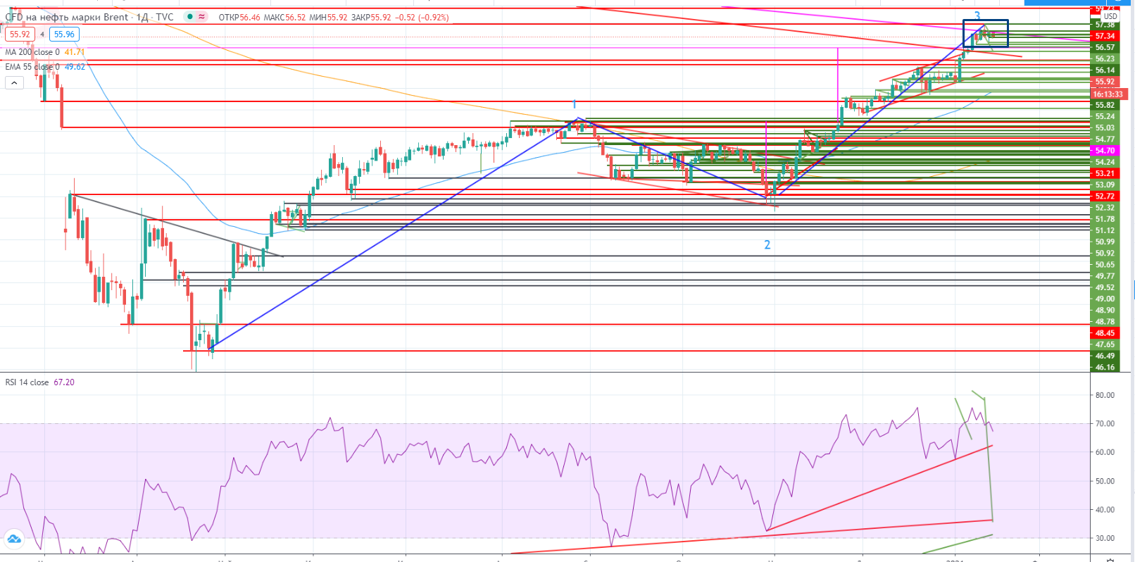 Зато на днях появилась попытка разворота вниз. Она пока очень слабая, и возможно я предвосхищаю события, но не растет ни один актив без коррекций, а в нефти она уже давно назрела. Так что закрытие недели может ознаменоваться подтверждением наметившейся разворотной формации.