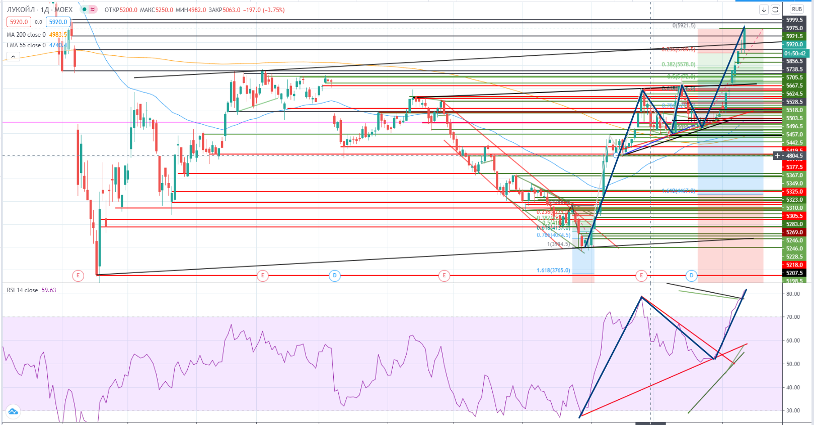 Нынешняя ситуация в Сбере у меня невольно ассоциируется примерно с аналогичной ситуацией в Лукойле. Стояли под реперным уровнем 5184, я стоял в шорте. Тренд только набирал силу. Но в моменте (на больше чем неделю) Лукойл пробил этот реперный уровень и даже несколько дней торговался выше. Я поверил, что падающий тренд сломлен и даже стал торговать в моменте от покупки. Потерпел убыток в оба конца.