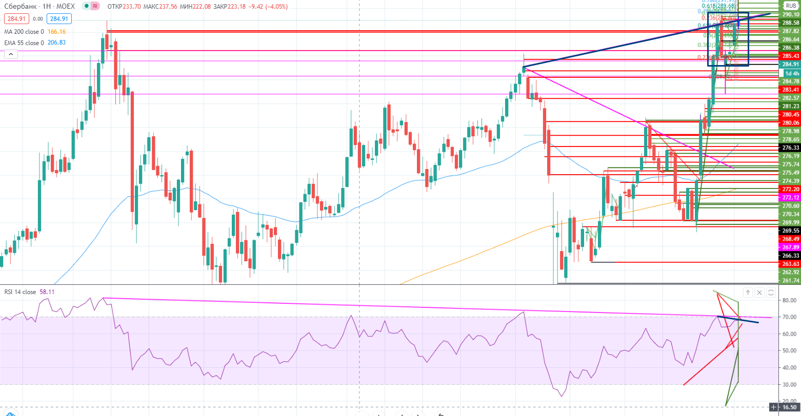 Есть очень много вариантов развития событий. Если все-же это была проверка реперного уровня, то можно рискнуть и купить Сбер при проходе 286,3+ со стопом 286-.