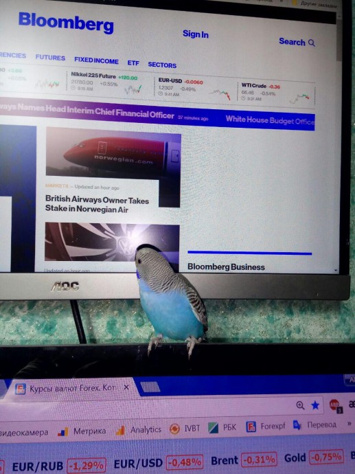 Затем я читал аналитику. Смотрел российские сайты с нашими аналитиками. Попугаю было не интересно, летал, посматривал, ругался снова летал. Но стоило врубить блумберг: