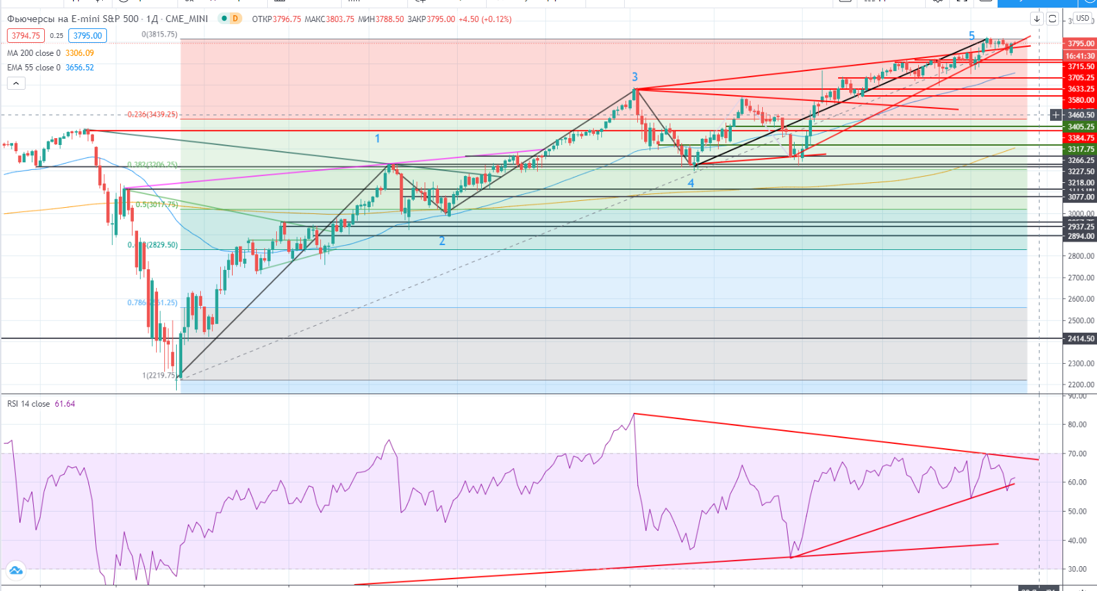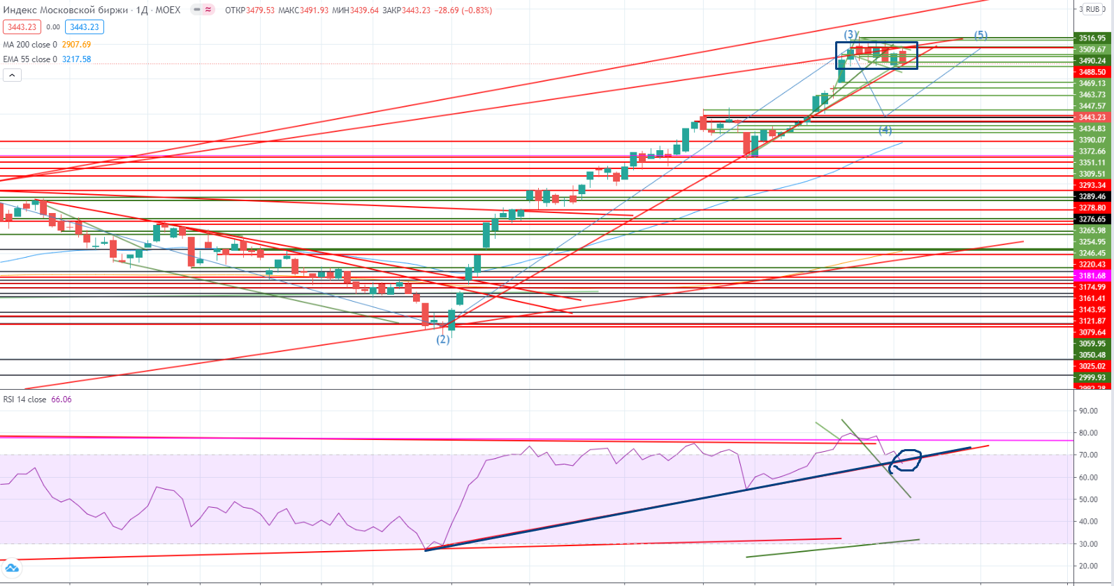На нашем фондовом рынке творилась полная неразбериха. Открылись на внешнем позитивном фоне крайне мегапозитивно, что я даже стал чувствовать себя в моменте очень дискомфортно, с учетом наличия шорта в Сбере (https://www.finam.ru/analysis/marketnews/posle-poyavleniya-reakcii-ssha-na-situaciyu-s-navalnym-rubl-mozhet-podeshevet-20210119-09200/). Но в результате день закрылся достаточно сильной черной свечой, которая пока НЕ ЯВЛЯЕТСЯ ни подтверждением разворотной формации, скорее всего рынок находится в некой пиле, но смотрящей вниз. В такой ситуации лучше сидеть «на заборе», чем торговать. Просто если даже на внешнем позитиве наш рынок не смог закрыться достойно, то что же будет в случае общей коррекции на внешних рынках?