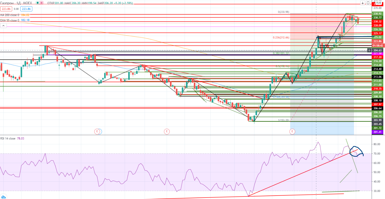 Но на этом фоне Газпром не сложился в разы, а в принципе тоже нарисовал нейтральную картину, НО приоритет конечно же ШОРТ (далеко до дневной поддержки).