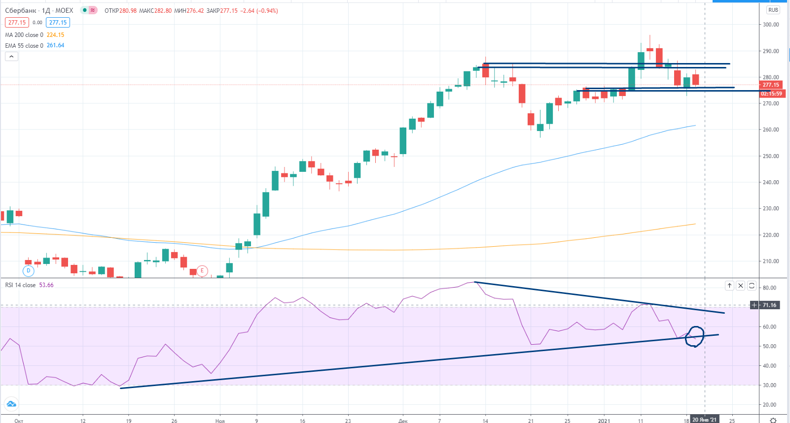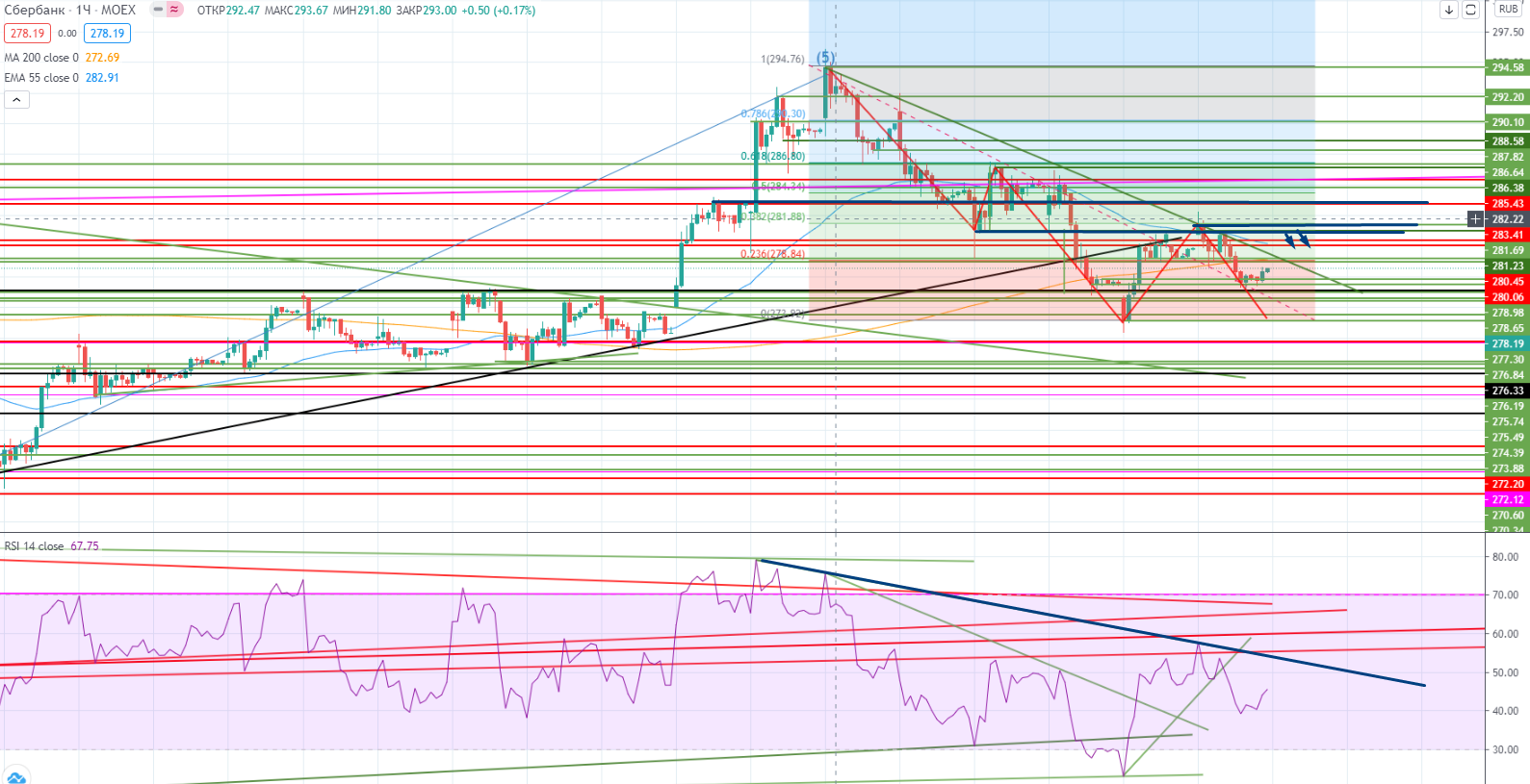 Сбер -нейтральная дневная картина, не пройдена зона 275,2-275,9 вниз, и остались под зоной 283,67-285. Что делать в такой ситуации я лично не знаю. То, что рисовалось вчера (https://www.finam.ru/analysis/marketnews/posle-poyavleniya-reakcii-ssha-na-situaciyu-s-navalnym-rubl-mozhet-podeshevet-20210119-09200/) частично сработало (правда я не дотерпел до вечера, хотя надо отметить, что я закрыл шорт на локальном дне, а после этого до моего офера не дошли совсем чуть-чуть). В принципе уровень остался, но чуть видоизменился, теперь он растянут до зоны 280,9-281,9, но стоп остался тот же, 282,1+ по закрытию часа. Но с течением времени все немного изменилось (55EMA ушла ниже, индикаторы уже не показывают однозначности), короче говоря что делать в Сбере я пока не знаю! Но надеюсь пойму что надо сделать в моменте.