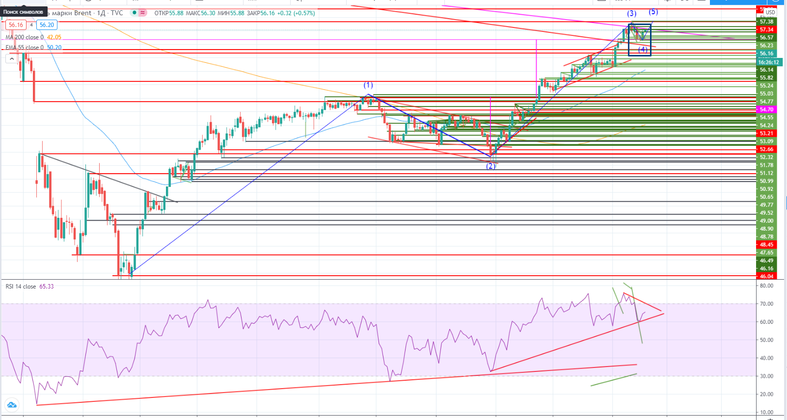 Нефть снова перешла в рост, но если я правильно понимаю волновую раскладку, то она может перешла к 5-ой волне (хотя 4-я была какая-то короткая). Либо это просто временный отскок. На данном этапе невозможно предсказать в какой волне находимся, единственное, что можно с уверенностью констатировать это отсутствие дивергенции на локальном хаю $56,7 и наличие разворотной формации в данный момент. Время как всегда все расставит по своим местам.