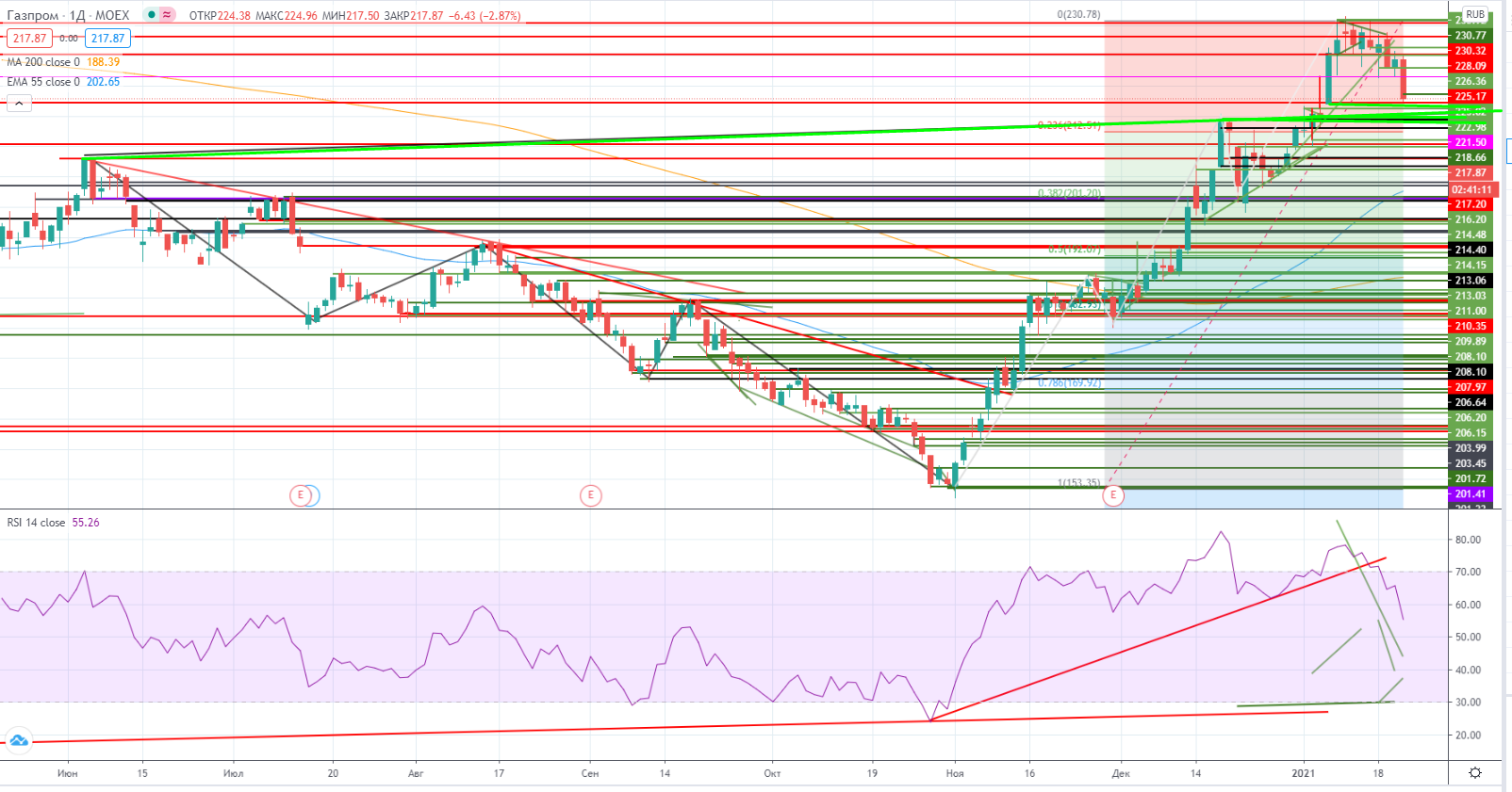 А вот в случае отскока наверх, точно можно будет продавать под 223 (горизонтальный уровень плюс 55EMA) со стопом 223,5+.