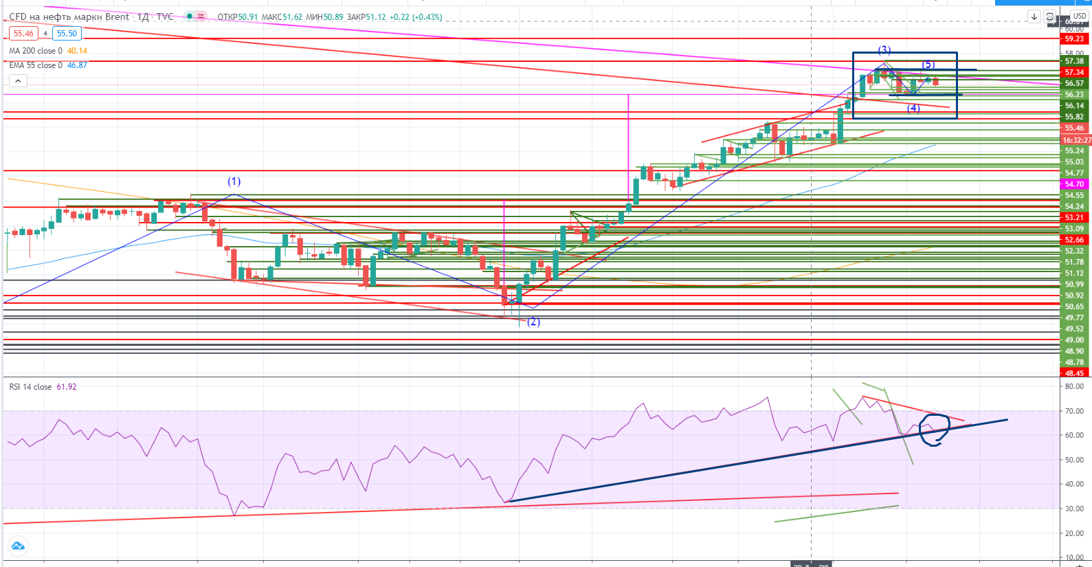 Пара доллар/рубль пробила свой тренд, и RSI тоже пробил свой малый дивергентный тренд вверх. Это скорее всего из-за митинга в поддержку Навального и реакции от наших и зарубежных властей. Патовая ситуация наблюдается, но я не хочу это обсуждать, хотя у меня есть свое мнение по этому поводу.