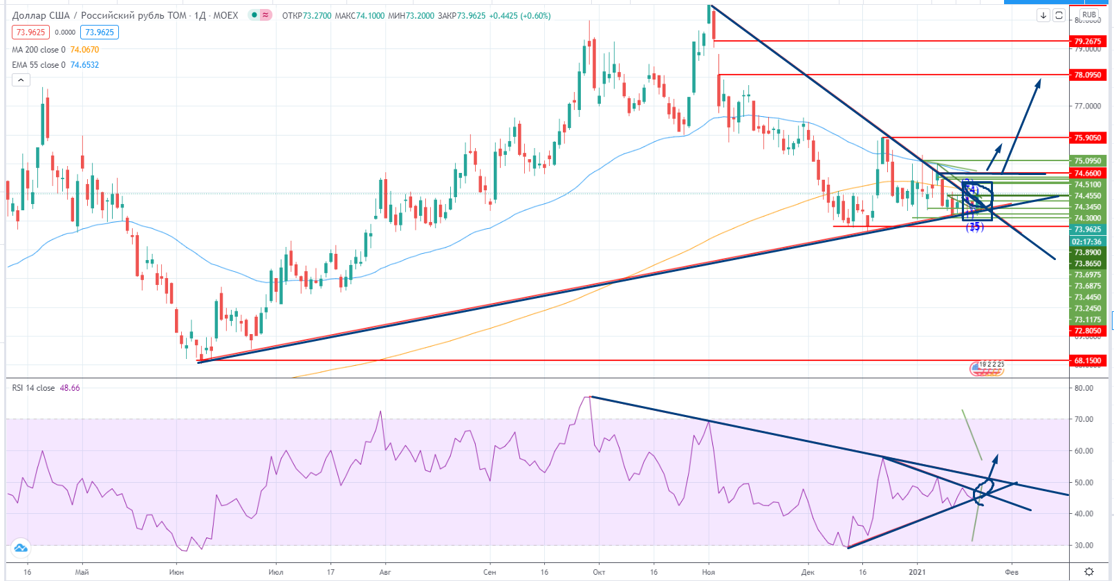 А судя по графику достаточно безопасно покупать доллар при проходе выше 74,66, тогда и RSI пересечет дивергентный тренд, и рост будет возможен к 75,9 как минимум, а как максимум-до незакрытого гэпа 78,09-79,34