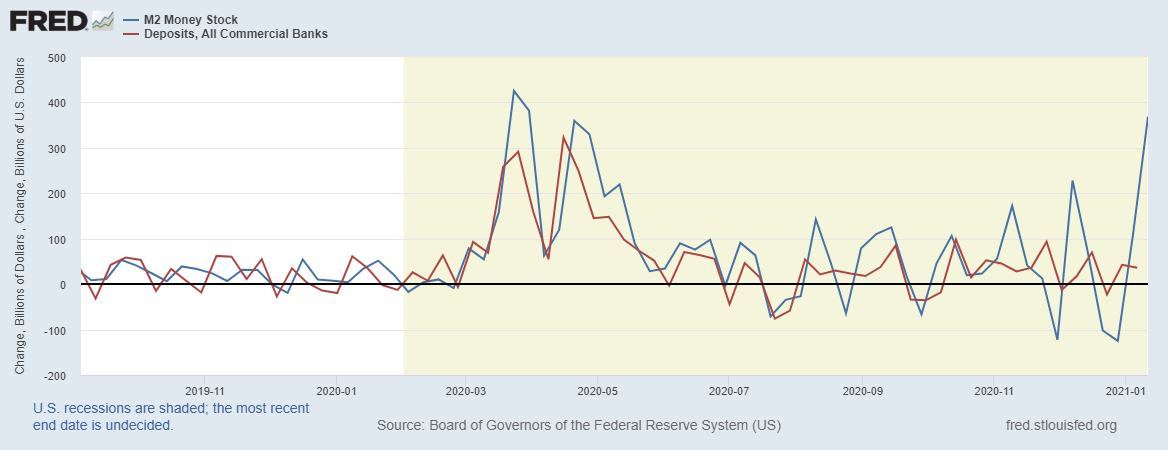 На фоне роста баланса ФРС и роста счет Казначейства, обьемов РЕПО и сбережений – вырос М2, при этом сразу на 369 млрд долларов