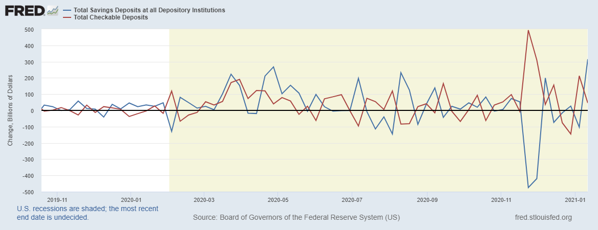 Синяя линия – это динамика от недели к неделе показателя срочных депозитов (сбережения);