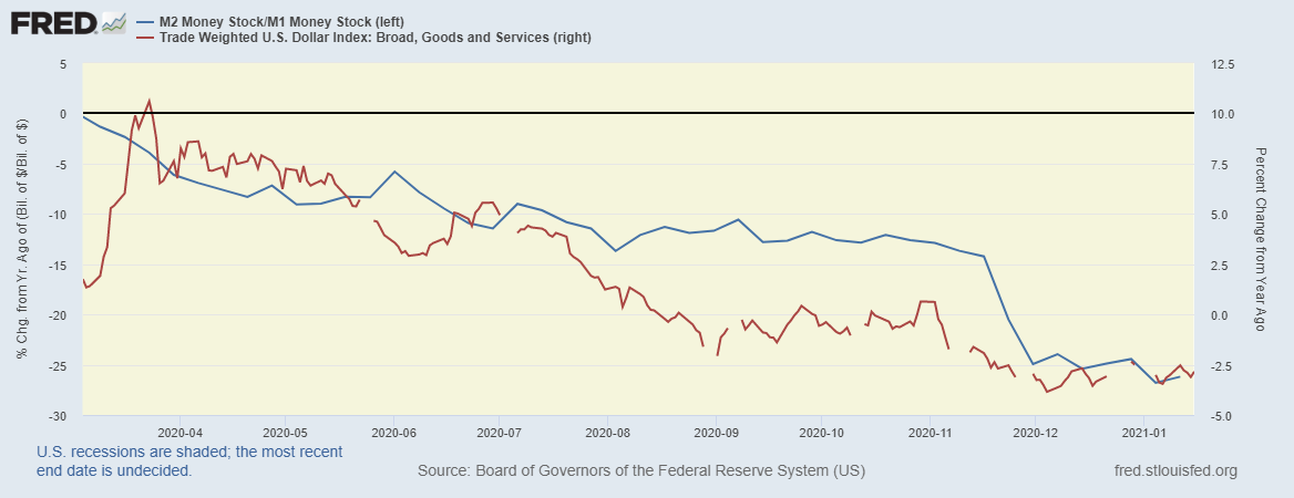 Синяя линия – это показатель М2 в динамике от года недели к неделе, темпы роста показателя сравнимы с динамикой показателя в марте 2020 года в разгар финансового кризиса;