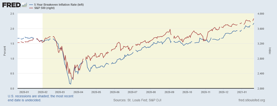 Красная линия – котировки широкого рынка, фондовый рынок США целиком и полностью детерминирован рефляционными ожиданиями.