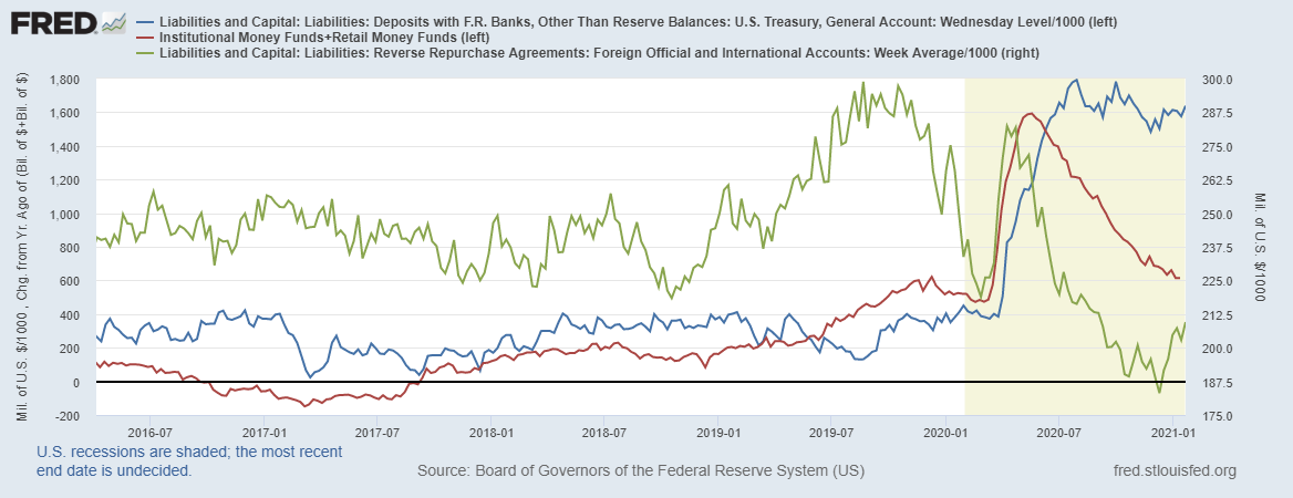 По данным показателям есть вопрос, т.к. с чего вдруг такой резкий рост? Это ответное действие на ухудшение ситуации с ликвидностью, или же это цикличный рост, цикл которого явно просматривается невооруженным взглядом. А может это начало заимствований Минфина под будущий пакет помощи, который демократы обещают подписать в начале февраля? Об этом мы узнаем в последующих выпусках.