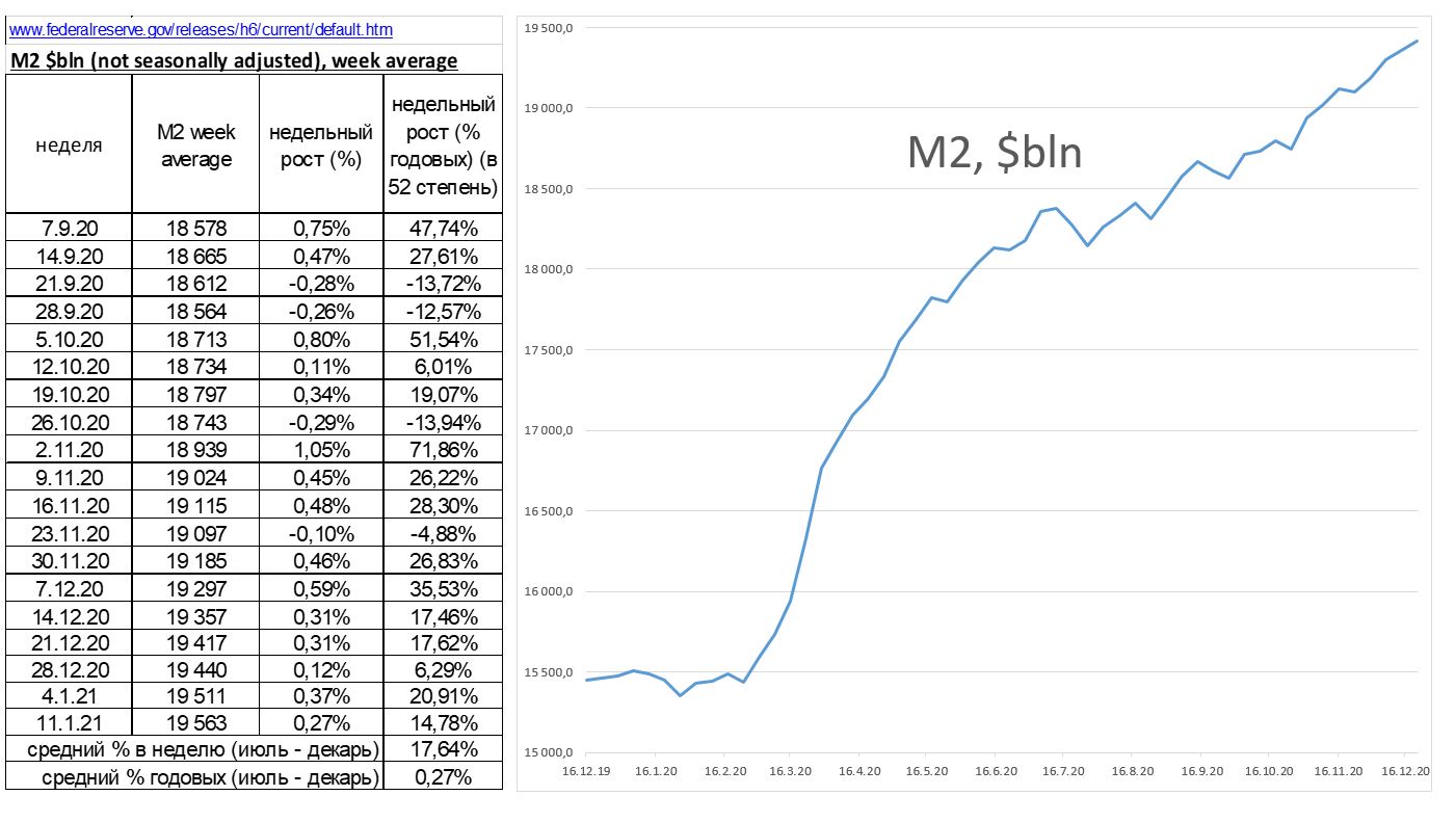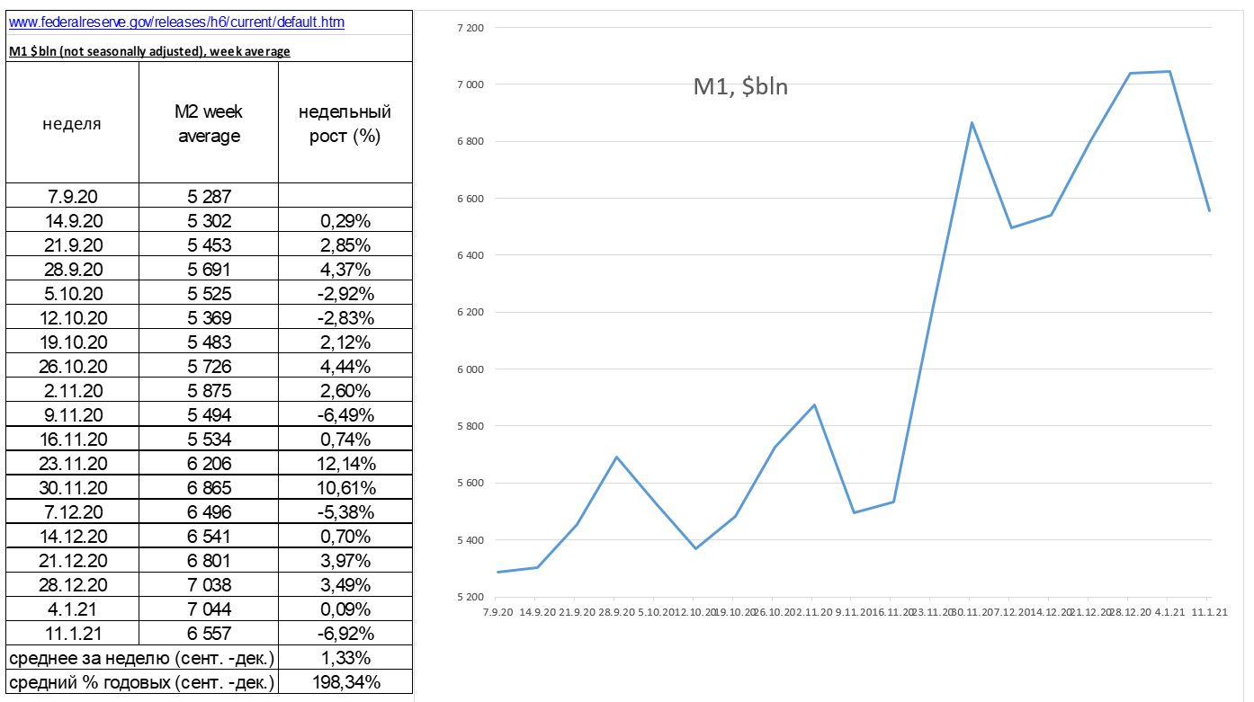 Денежная масса М1 США с 4 по 11 января 21г.снизилась на 7%, М2 выросла на 0.26%.