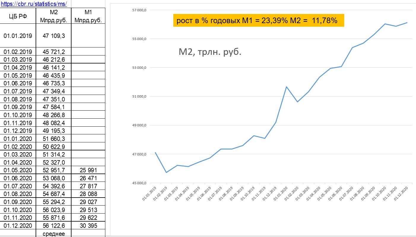 В 2020г. денежная масса М2 в РФ выросла на 12%, денежная масса М1 на 23%,